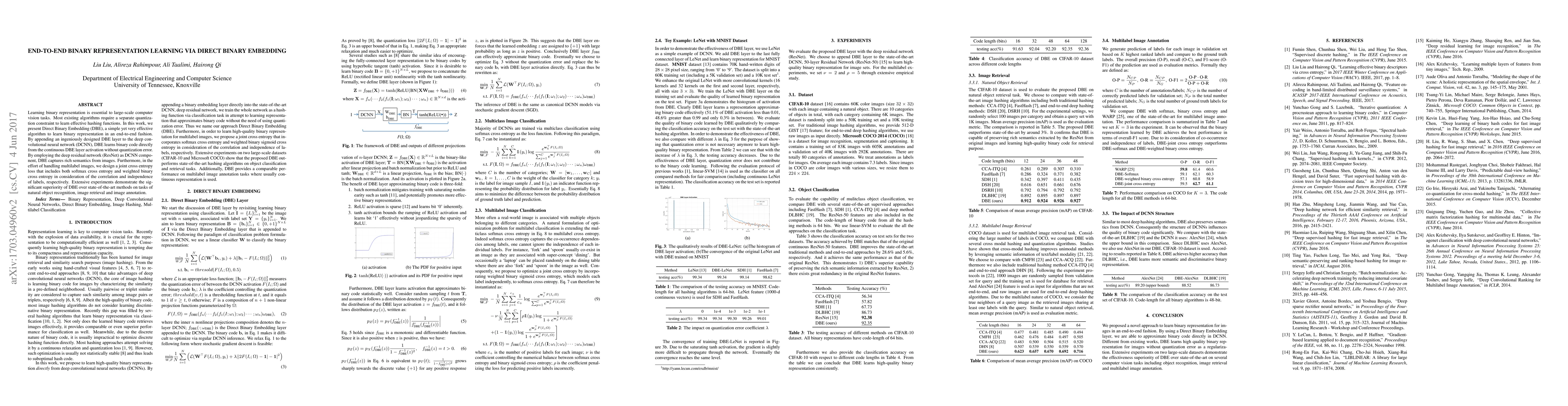 Learning binary representation is essential to large-scale computer vision tasks. Most existing algorithms require a separate quantization constraint to learn effective hashing functions. In this work, we present Direct Binary Embedding (DBE), a simple yet very effective algorithm to learn binary representation in an end-to-end fashion. By appending an ingeniously designed DBE layer to the deep convolutional neural network (DCNN), DBE learns binary code directly from the continuous DBE layer activation without quantization error. By employing the deep residual network (ResNet) as DCNN component, DBE captures rich semantics from images. Furthermore, in the effort of handling multilabel images, we design a joint cross entropy loss that includes both softmax cross entropy and weighted binary cross entropy in consideration of the correlation and independence of labels, respectively. Extensive experiments demonstrate the significant superiority of DBE over state-of-the-art methods on tasks of natural object recognition, image retrieval and image annotation.