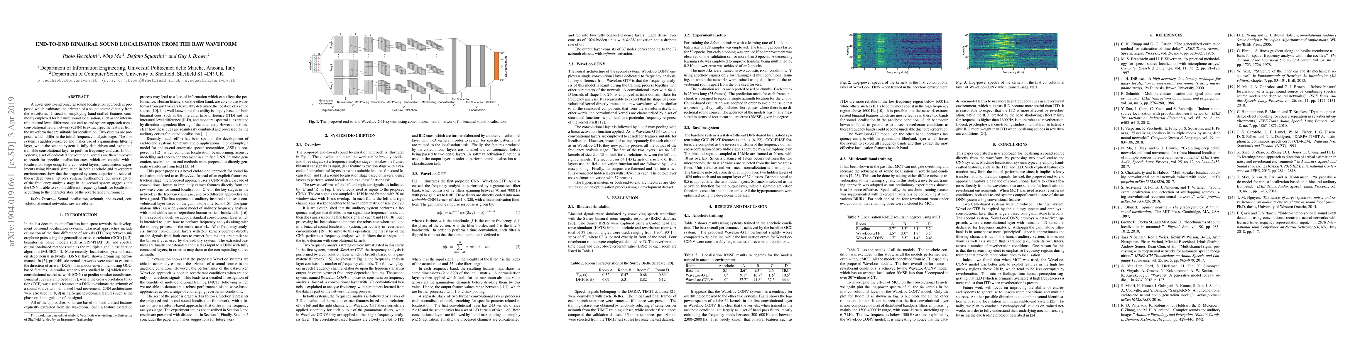 This research introduces a novel end-to-end convolutional neural network (CNN) approach for binaural sound localization, directly estimating sound source azimuth from raw waveforms. The study proposes two systems, one inspired by auditory mechanisms and one fully data-driven, both showing superior performance compared to existing methods in various environments. For further details, please refer to the original paper.