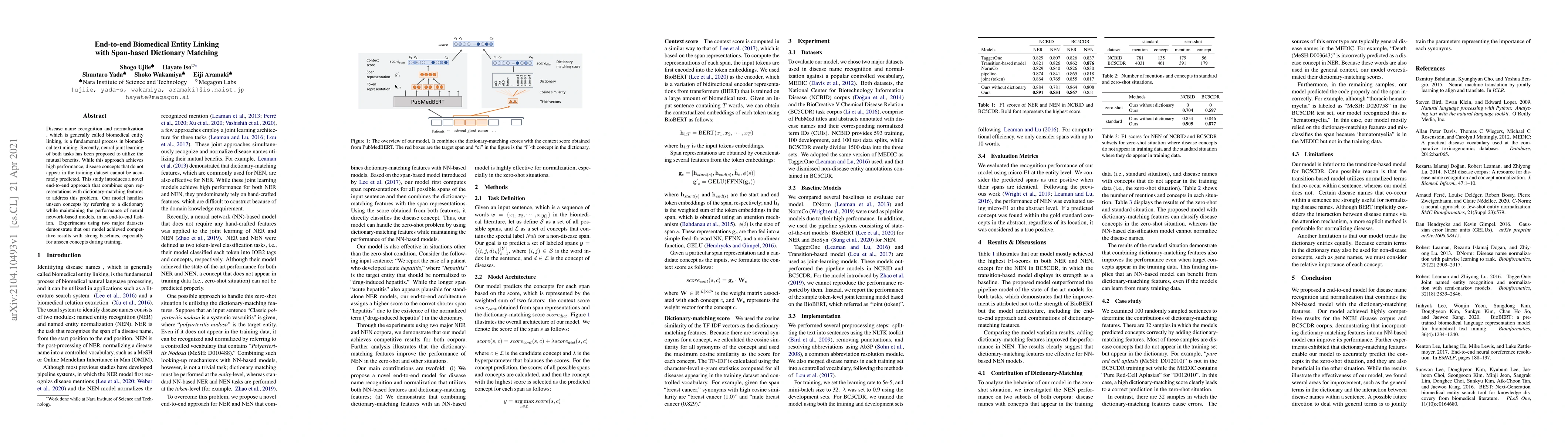 This paper proposes an end-to-end biomedical entity linking method that combines span representations with dictionary matching to handle unseen disease concepts. The model achieves competitive performance on major datasets, especially for concepts not present in the training data, by leveraging dictionary features.