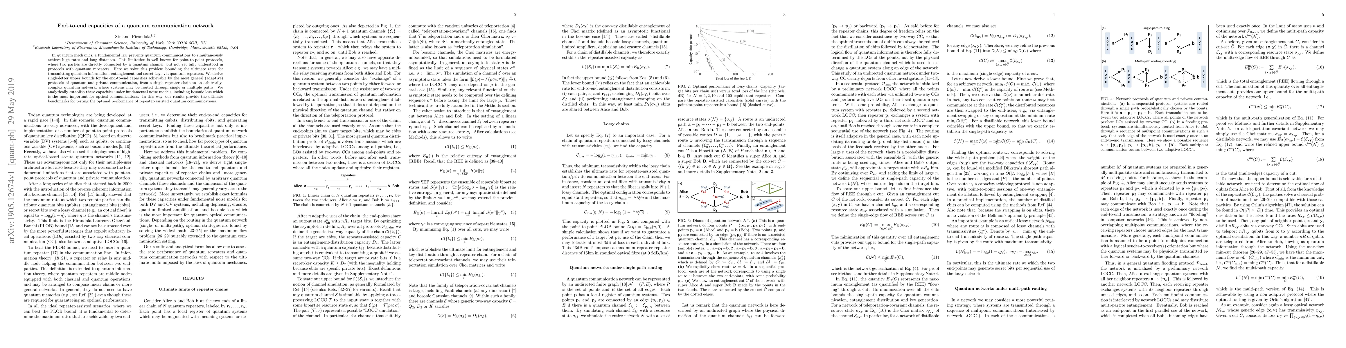 This paper establishes upper bounds on the end-to-end capacities for quantum information, entanglement, and secret keys in quantum communication networks utilizing quantum repeaters. The study provides analytical benchmarks for evaluating the optimal performance of such networks under fundamental noise models, including optical bosonic loss.