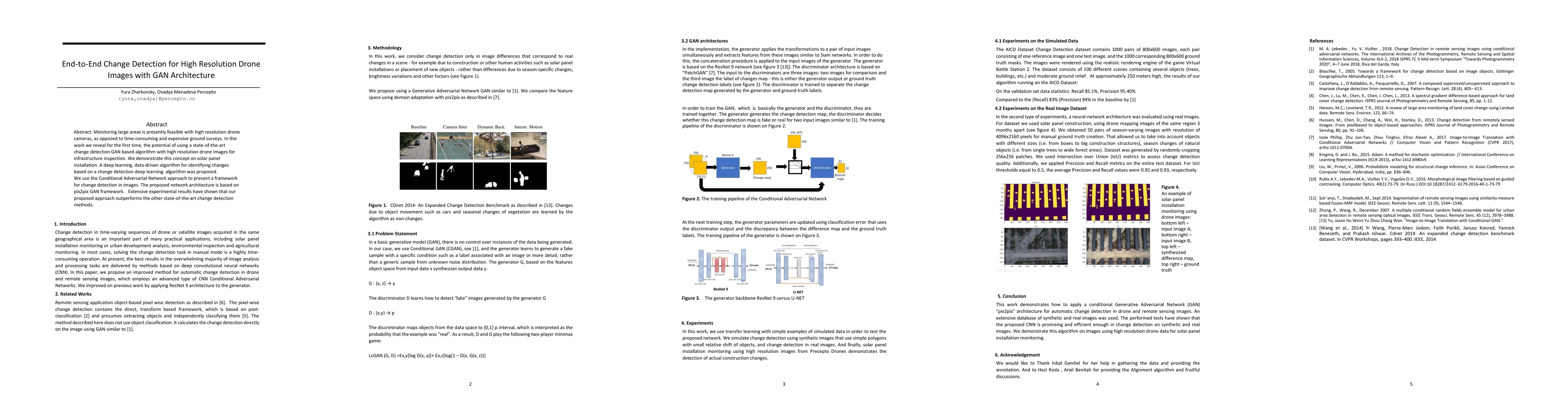 This work is novel in its application of the pix2pix GAN architecture specifically for change detection in drone imagery, focusing on infrastructure inspection tasks like solar panel installations.