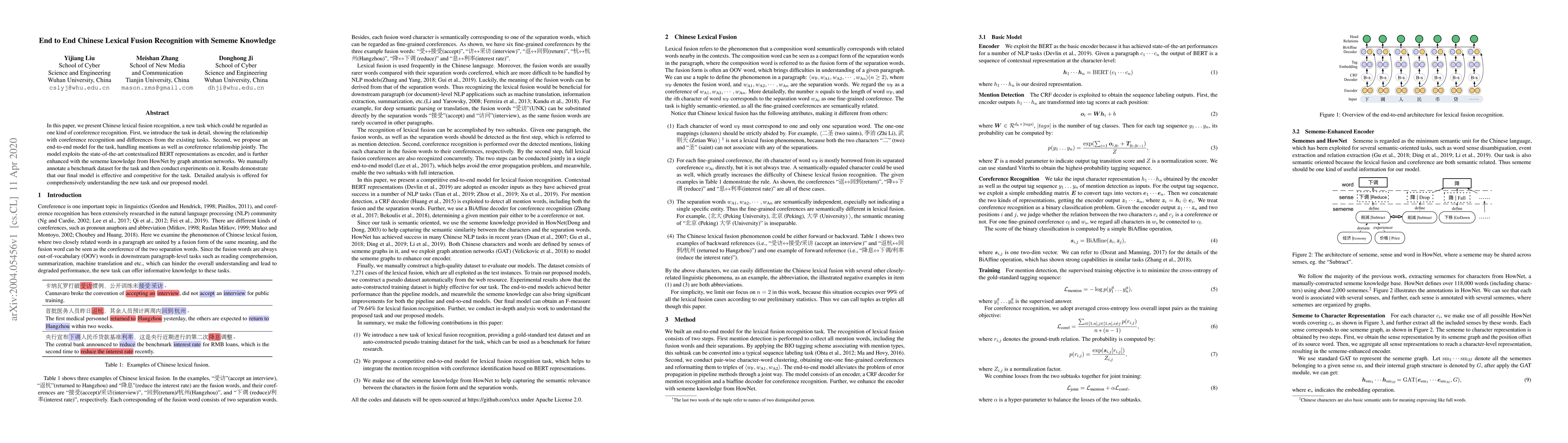 This paper introduces a new task of Chinese lexical fusion recognition, akin to coreference recognition, and proposes an end-to-end joint model leveraging BERT and sememe knowledge from HowNet to enhance performance. Experiments on a manually annotated dataset show the effectiveness of the proposed model.