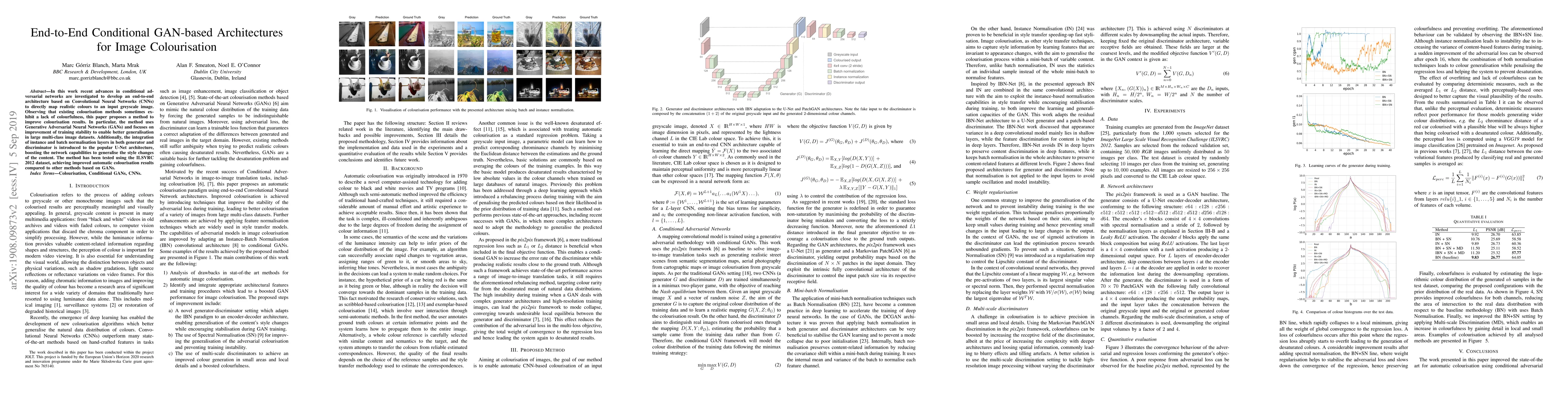 This paper proposes an end-to-end GAN-based architecture for image colorisation, improving training stability and generalization in large multi-class datasets. The method achieves improved automatic colorisation results compared to other methods using similar architectures.