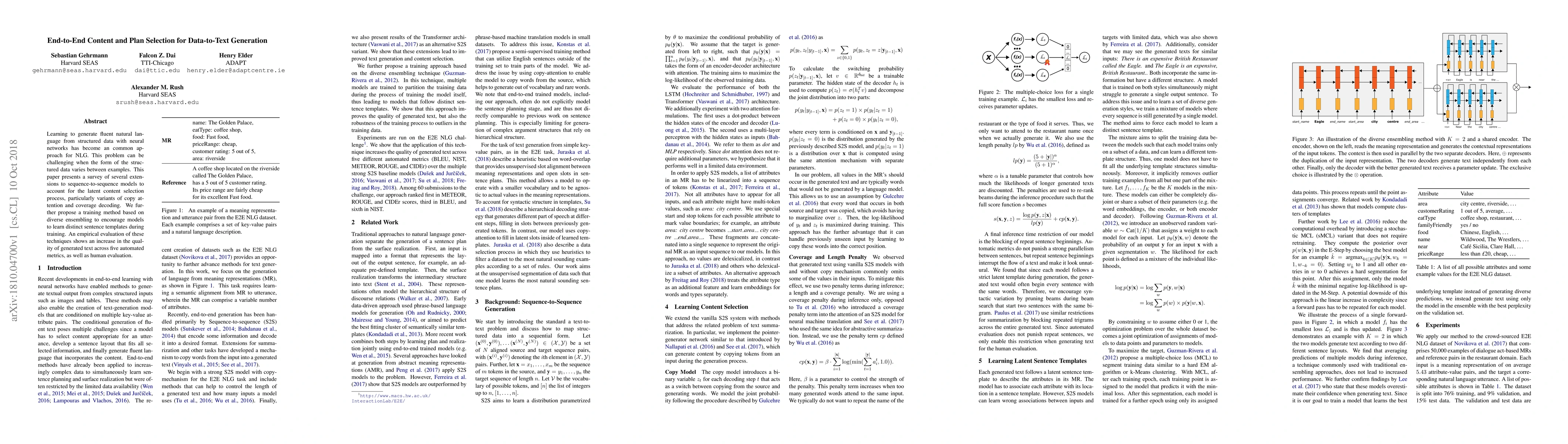 This paper surveys neural network extensions for data-to-text generation, focusing on content selection and plan selection, and proposes a diverse ensembling training method. Empirical results show improved text quality across automated metrics and human evaluation.