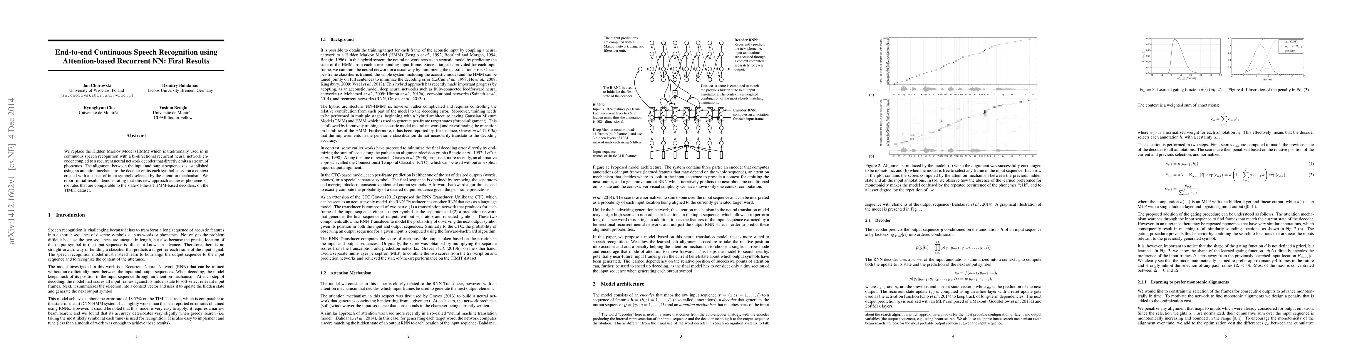 This paper introduces a new end-to-end continuous speech recognition system using a bi-directional RNN encoder and RNN decoder with attention, replacing traditional HMM-based methods. Initial results show comparable phoneme error rates to state-of-the-art HMM decoders on the TIMIT dataset.