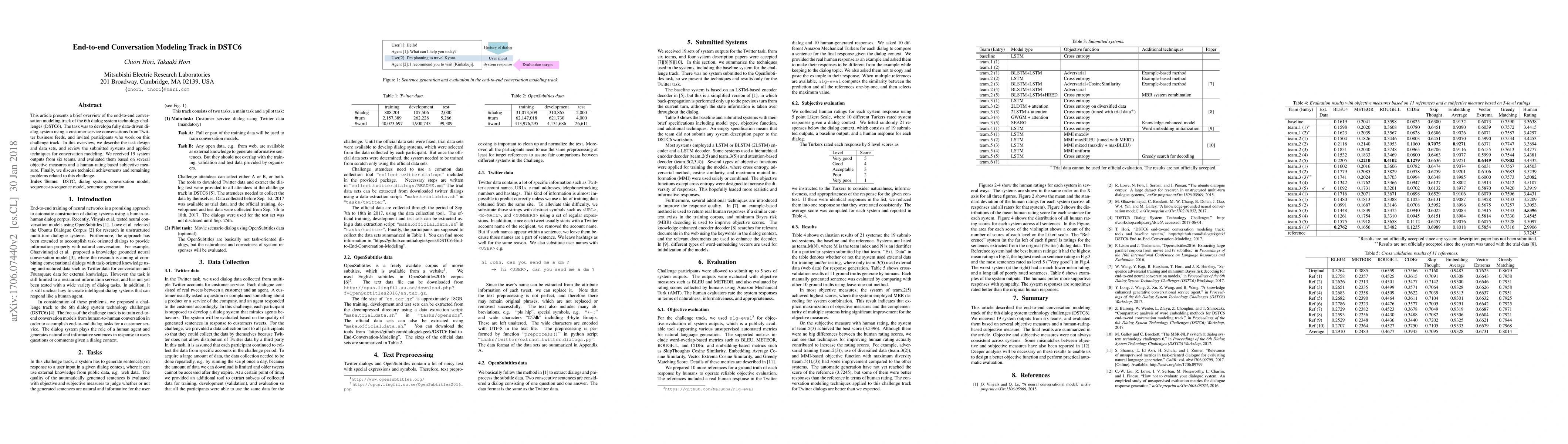End-to-end training of neural networks is a promising approach to automatic construction of dialog systems using a human-to-human dialog corpus. Recently, Vinyals et al. tested neural conversation models using OpenSubtitles. Lowe et al. released the Ubuntu Dialogue Corpus for researching unstructured multi-turn dialogue systems. Furthermore, the approach has been extended to accomplish task oriented dialogs to provide information properly with natural conversation. For example, Ghazvininejad et al. proposed a knowledge grounded neural conversation model [3], where the research is aiming at combining conversational dialogs with task-oriented knowledge using unstructured data such as Twitter data for conversation and Foursquare data for external knowledge.However, the task is still limited to a restaurant information service, and has not yet been tested with a wide variety of dialog tasks. In addition, it is still unclear how to create intelligent dialog systems that can respond like a human agent. In consideration of these problems, we proposed a challenge track to the 6th dialog system technology challenges (DSTC6) using human-to-human dialog data to mimic human dialog behaviors. The focus of the challenge track is to train end-to-end conversation models from human-to-human conversation and accomplish end-to-end dialog tasks in various situations assuming a customer service, in which a system plays a role of human agent and generates natural and informative sentences in response to user's questions or comments given dialog context.