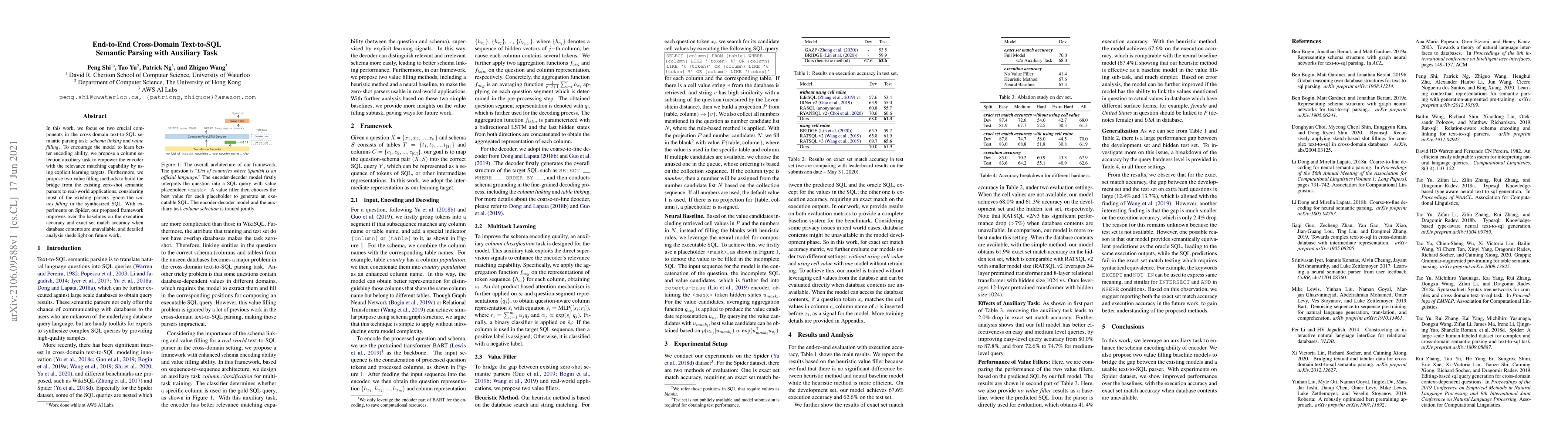 This paper proposes an end-to-end framework for cross-domain text-to-SQL semantic parsing, focusing on schema linking and value filling, and introduces an auxiliary column selection task to enhance the model's encoding ability, demonstrating improved execution and set match accuracy on the Spider dataset.