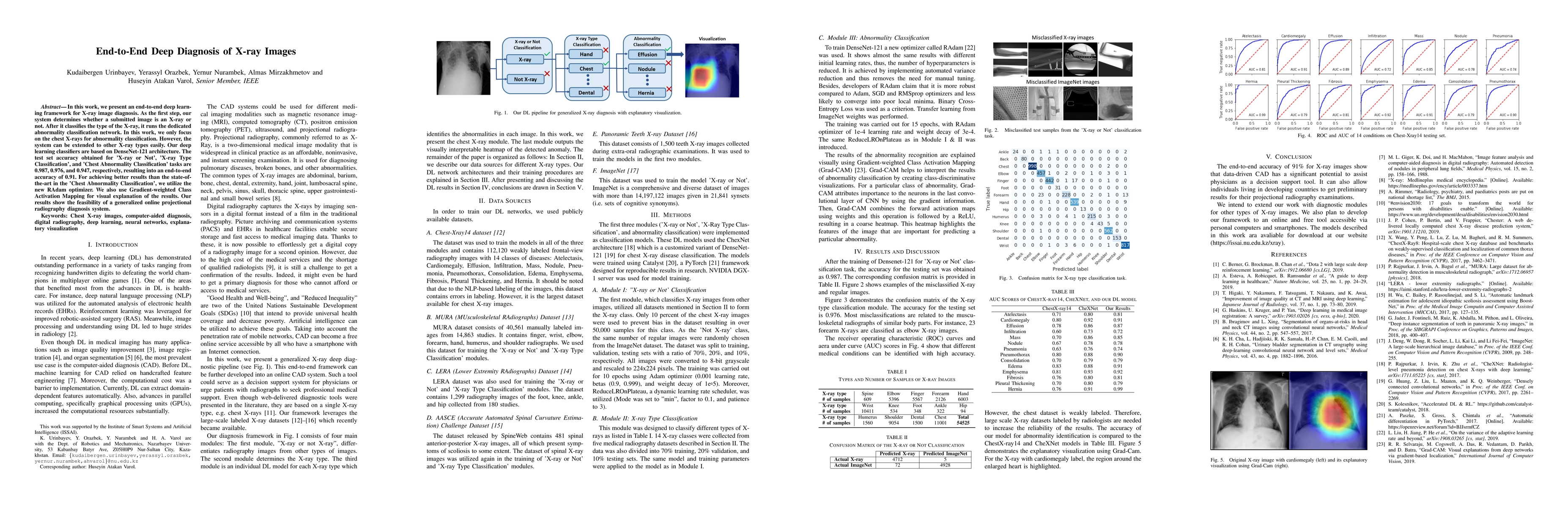 This paper introduces an end-to-end deep learning framework using DenseNet-121 for X-ray image diagnosis, achieving high accuracy in identifying X-rays, classifying their types, and detecting chest abnormalities with an overall accuracy of 91%. The system employs the RAdam optimizer and Grad-CAM for enhanced performance and visual explanations.