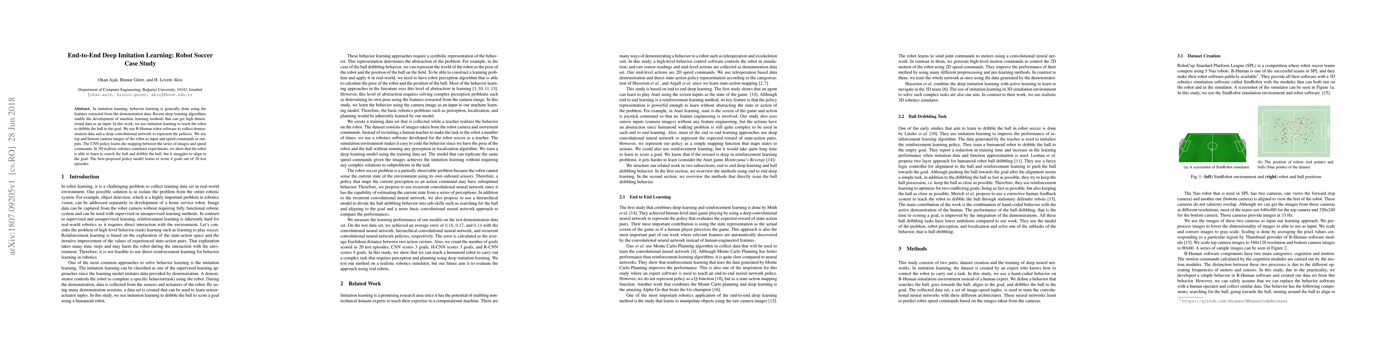 Researchers successfully taught a robot to dribble a ball in a soccer game using deep imitation learning, achieving 4 out of 20 test goals. The approach showed promise but struggled with aligning the robot to the goal.