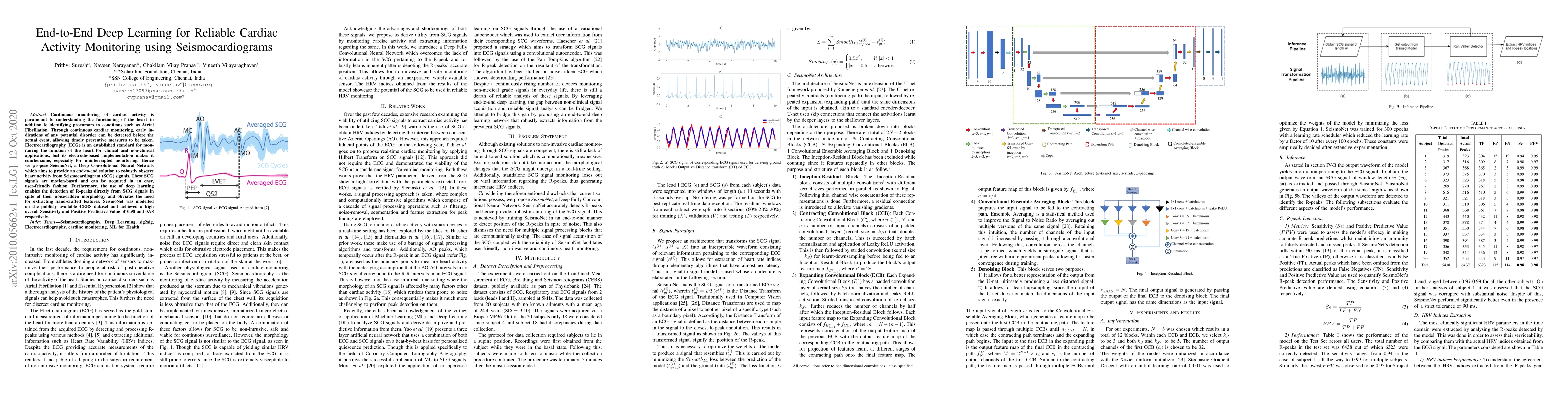 This paper proposes SeismoNet, a Deep Convolutional Neural Network for continuous cardiac monitoring using Seismocardiogram (SCG) signals, offering a non-invasive alternative to traditional ECG. SeismoNet achieves high accuracy in detecting R-peaks directly from noisy SCG data, demonstrating a Sensitivity and Positive Predictive Value of 0.98 each.