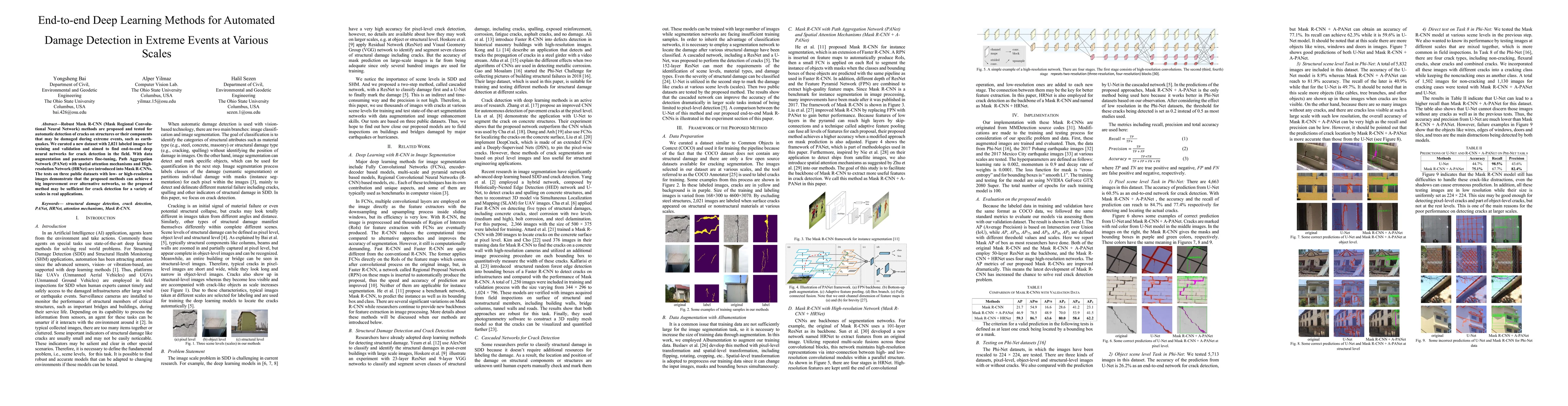 This paper proposes robust Mask R-CNN methods enhanced with Path Aggregation Network and High-resolution Network for automated crack detection in structures after extreme events. The new dataset and fine-tuning techniques show significant improvements over alternative networks, indicating the method's effectiveness across various scales.