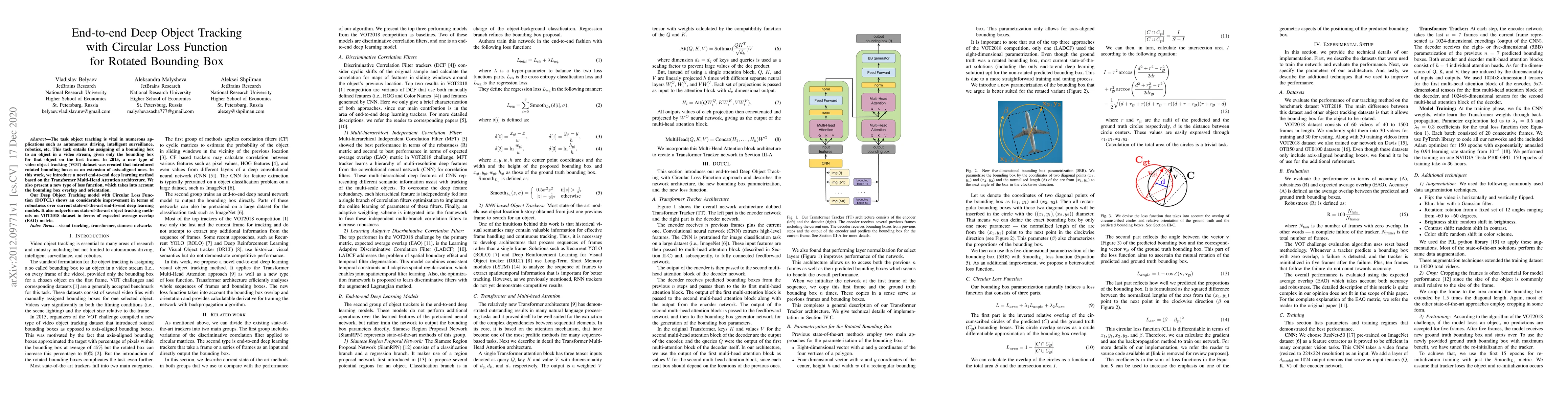 The task object tracking is vital in numerous applications such as autonomous driving, intelligent surveillance, robotics, etc. This task entails the assigning of a bounding box to an object in a video stream, given only the bounding box for that object on the first frame. In 2015, a new type of video object tracking (VOT) dataset was created that introduced rotated bounding boxes as an extension of axis-aligned ones. In this work, we introduce a novel end-to-end deep learning method based on the Transformer Multi-Head Attention architecture. We also present a new type of loss function, which takes into account the bounding box overlap and orientation. Our Deep Object Tracking model with Circular Loss Function (DOTCL) shows an considerable improvement in terms of robustness over current state-of-the-art end-to-end deep learning models. It also outperforms state-of-the-art object tracking methods on VOT2018 dataset in terms of expected average overlap (EAO) metric.