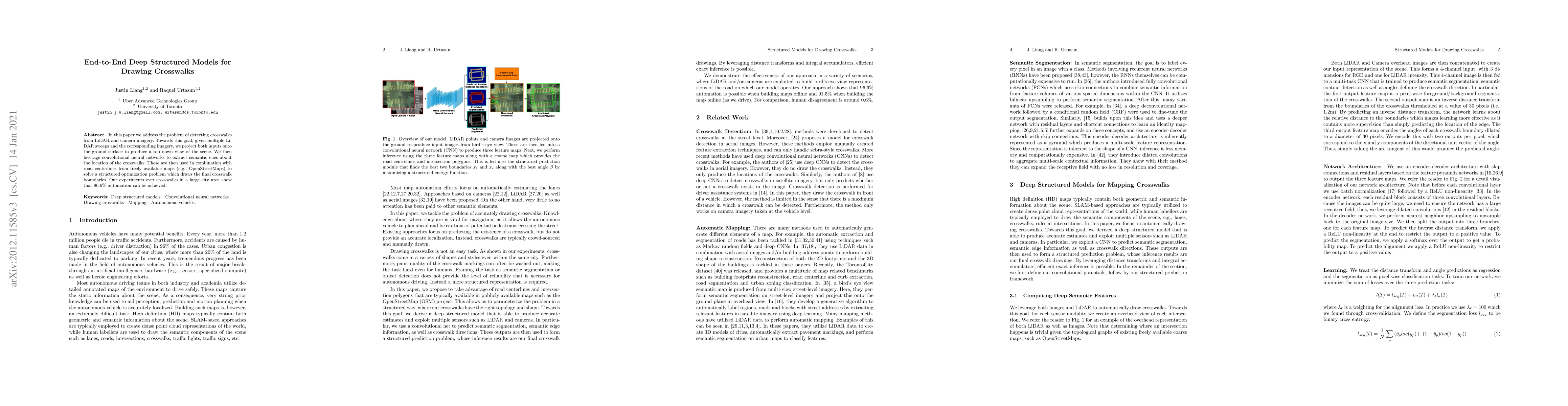 In this paper we address the problem of detecting crosswalks from LiDAR and camera imagery. Towards this goal, given multiple LiDAR sweeps and the corresponding imagery, we project both inputs onto the ground surface to produce a top down view of the scene. We then leverage convolutional neural networks to extract semantic cues about the location of the crosswalks. These are then used in combination with road centerlines from freely available maps (e.g., OpenStreetMaps) to solve a structured optimization problem which draws the final crosswalk boundaries. Our experiments over crosswalks in a large city area show that 96.6% automation can be achieved.