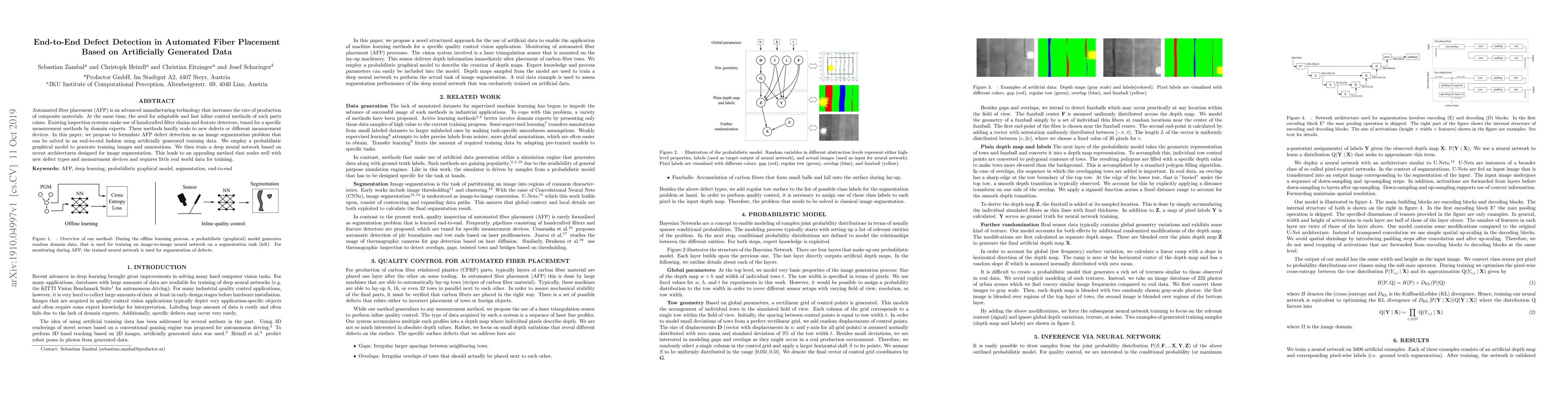 This paper proposes an end-to-end defect detection method for automated fiber placement using artificially generated training data and deep neural networks for image segmentation. The approach scales well with new defect types and measurement devices with minimal real-world data.