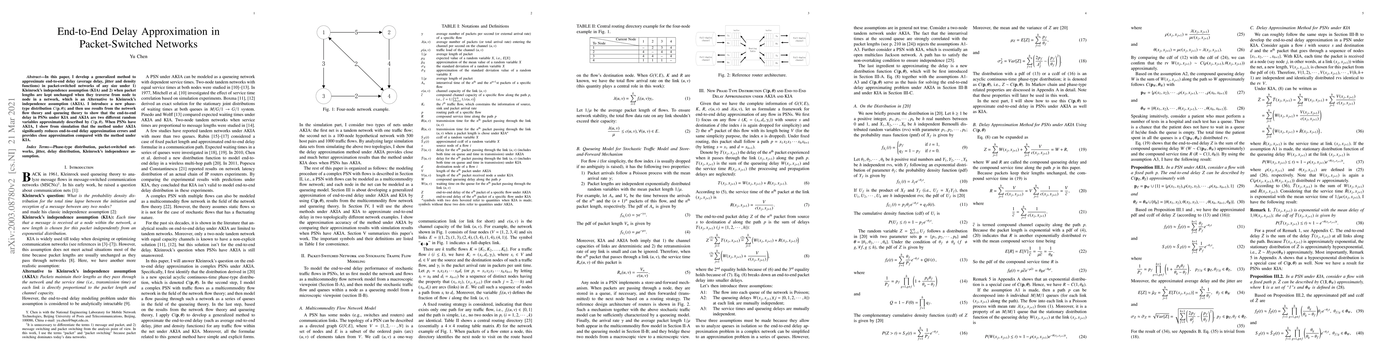 This paper proposes a generalized method to approximate end-to-end delay in packet-switched networks using a new phase-type distribution $C(\mathbf{p},\boldsymbol \theta)$. It compares approximations under Kleinrock's independence assumption and an alternative assumption, showing that the alternative significantly reduces approximation errors.