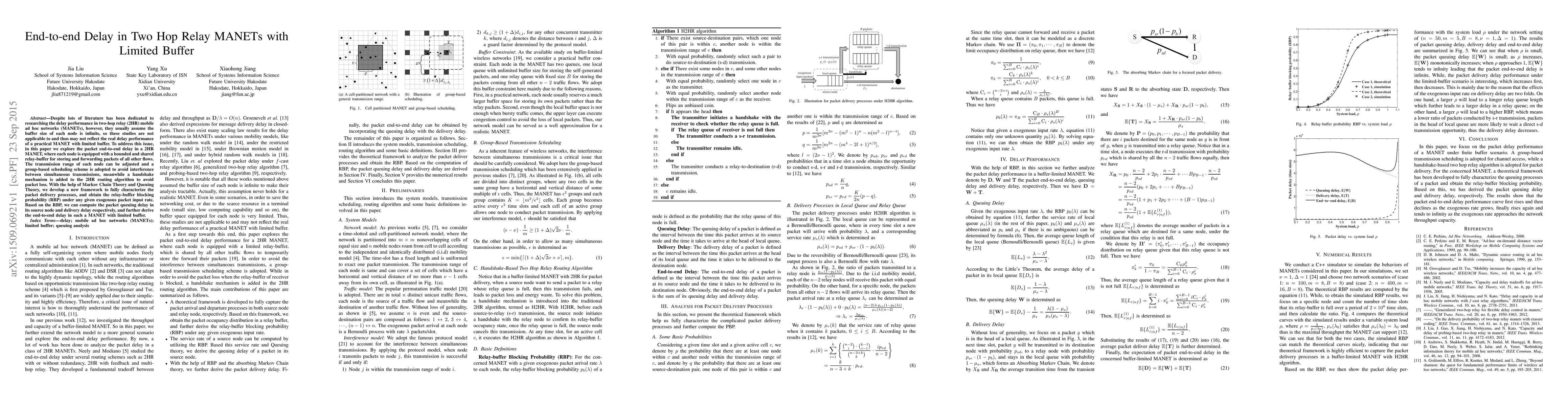 This paper investigates end-to-end delay in two-hop relay mobile ad hoc networks (MANETs) with limited buffer sizes, developing a new framework using Markov Chain and Queuing Theory to characterize packet delivery processes. It introduces a group-based scheduling scheme and a handshake mechanism to manage interference and packet loss, deriving the end-to-end delay under bounded relay-buffer conditions.