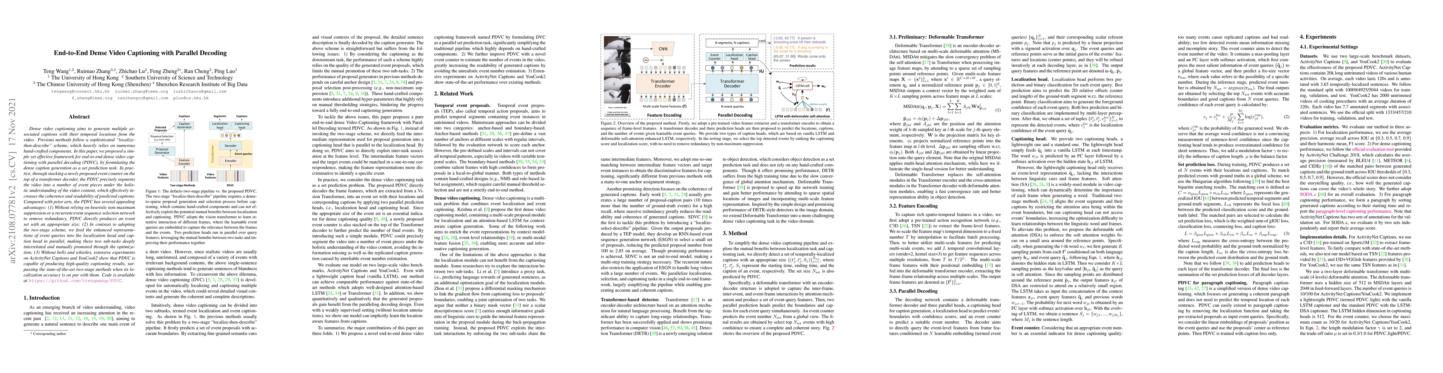 This paper proposes a novel end-to-end framework called Parallel Decoding Dense Video Captioning (PDVC) for generating multiple captions with temporal locations from videos. Unlike previous methods, PDVC segments videos into event pieces and directly produces an event set without redundancy, achieving high-quality captioning results that surpass state-of-the-art two-stage methods.