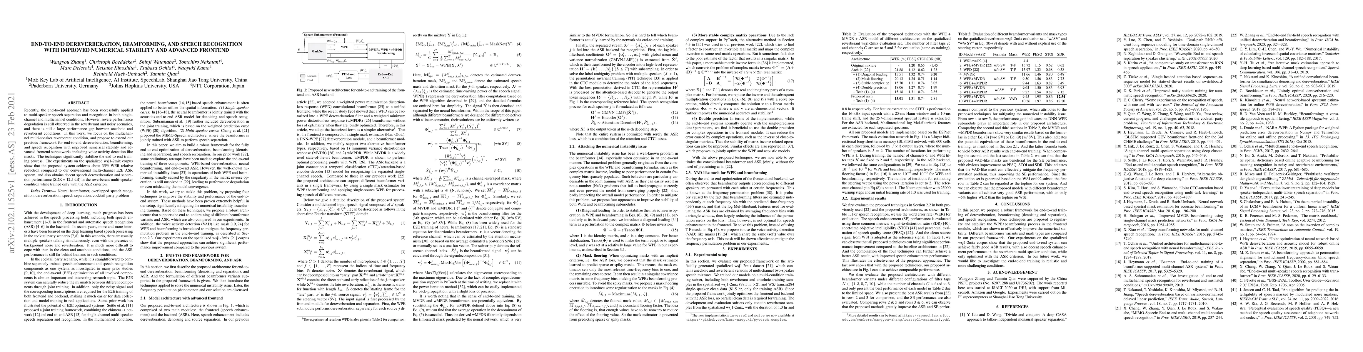 This paper proposes an enhanced end-to-end framework for dereverberation, beamforming, and speech recognition, achieving significant improvements in numerical stability and performance in reverberant conditions. The new system reduces word error rate by 35% compared to conventional methods, demonstrating effective speech separation and dereverberation.
