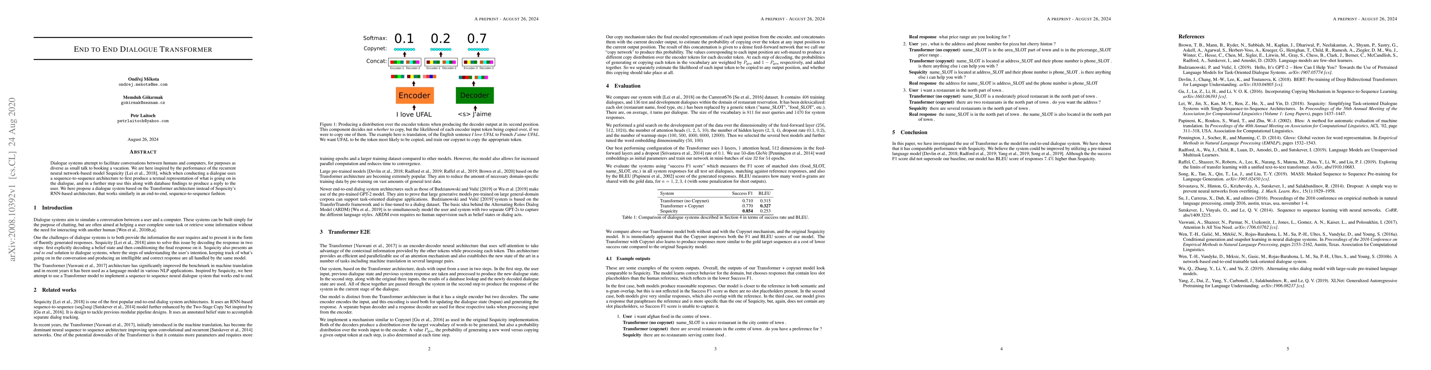 Dialogue systems attempt to facilitate conversations between humans and computers, for purposes as diverse as small talk to booking a vacation. We are here inspired by the performance of the recurrent neural network-based model Sequicity, which when conducting a dialogue uses a sequence-to-sequence architecture to first produce a textual representation of what is going on in the dialogue, and in a further step use this along with database findings to produce a reply to the user. We here propose a dialogue system based on the Transformer architecture instead of Sequicity's RNN-based architecture, that works similarly in an end-to-end, sequence-to-sequence fashion.