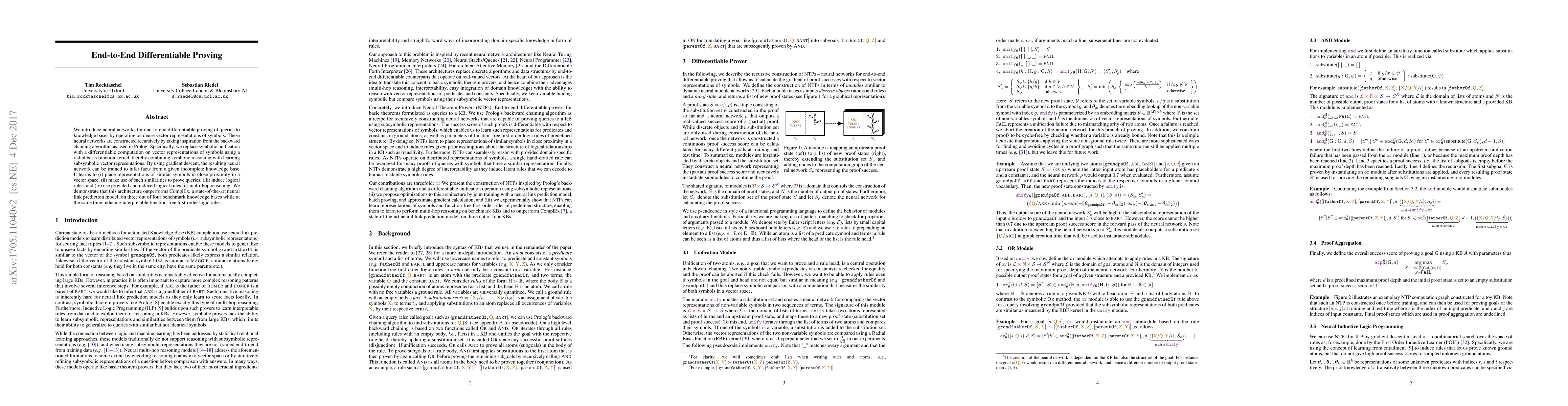 This paper proposes neural networks that perform end-to-end differentiable proving of queries in knowledge bases using dense vector representations, inspired by backward chaining. It combines symbolic reasoning with machine learning, showing improved performance over ComplEx on several benchmarks.