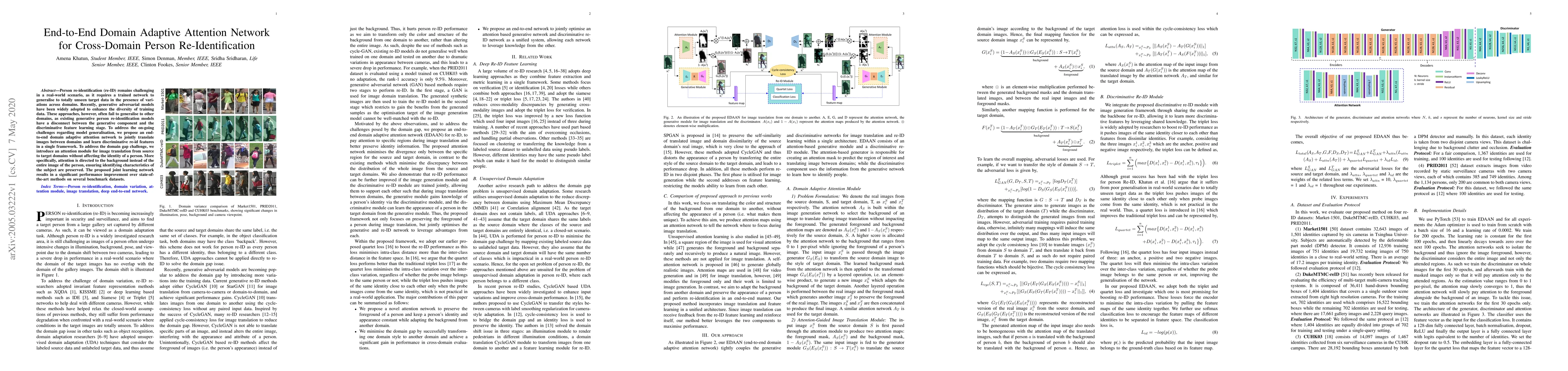 This paper proposes an end-to-end domain adaptive attention network for cross-domain person re-identification, addressing the domain gap by translating images while preserving person identity through an attention-based background translation. The joint learning framework significantly outperforms existing methods on benchmark datasets.