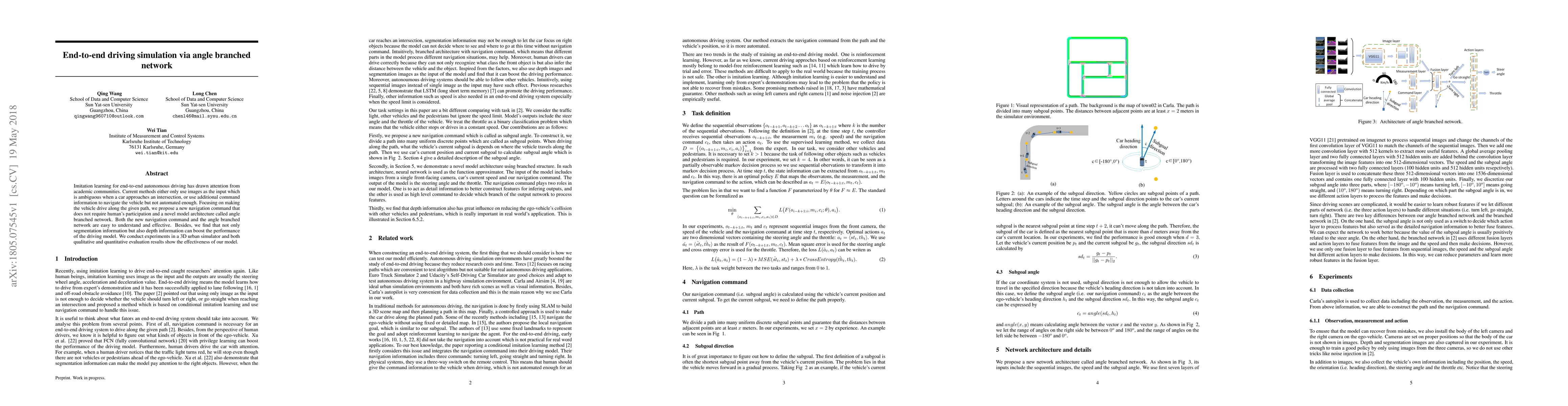 A new navigation command and angle branched network architecture improve end-to-end autonomous driving simulations without human participation, using both segmentation and depth information for enhanced performance.