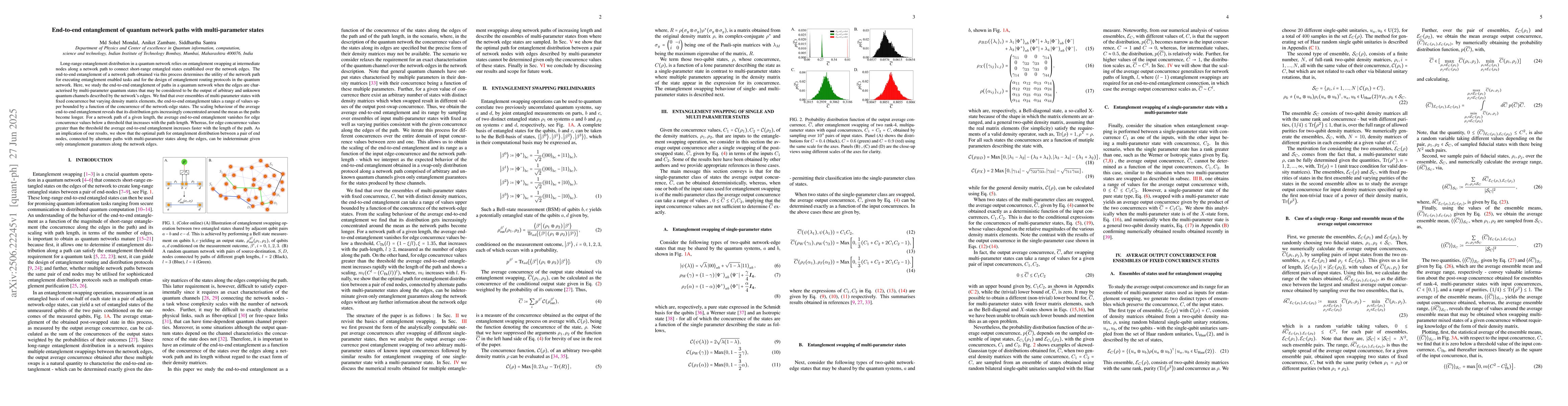 Long-range entanglement distribution in a quantum network relies on entanglement swapping at intermediate nodes along a network path to connect short-range entangled states established over the network edges. The end-to-end entanglement of a network path obtained via this process determines the utility of the network path for executing entanglement enabled tasks and for the design of entanglement routing protocols in the quantum network. Here, we study the end-to-end entanglement of paths in a quantum network when the edges are characterised by multi-parameter quantum states that may be considered to be the output of arbitrary and unknown quantum channels described by the network's edges. We find that over ensembles of multi-parameter states with fixed concurrence but varying density matrix elements, the end-to-end entanglement takes a range of values upper bounded by a function of the concurrence of the network-edge states. The scaling behaviour of the average end-to-end entanglement reveals that its distribution gets increasingly concentrated around the mean as the paths become longer. For a network path of a given length, the average end-to-end entanglement vanishes for edge concurrence values below a threshold that increases with the path-length. Whereas, for edge concurrence values greater than the threshold the average end-to-end entanglement increases faster with the length of the path. As an implication of our results, we show that the optimal path for entanglement distribution between a pair of end nodes, connected by alternate paths with multi-parameter states along the edges, can be indeterminate given only entanglement guarantees along the network edges.