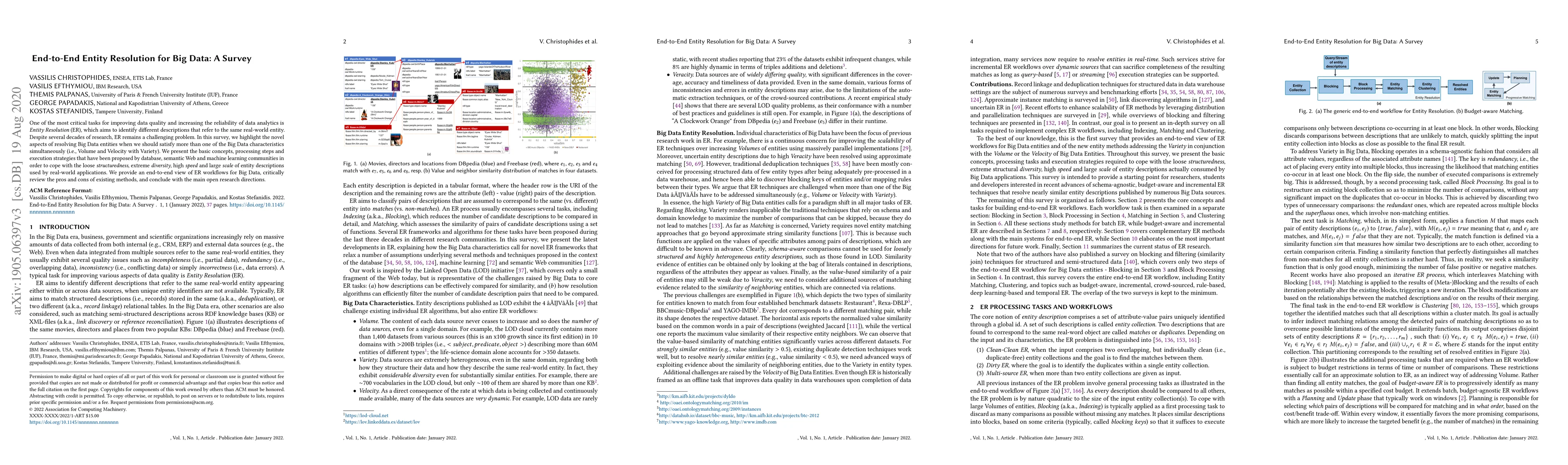 This survey provides an end-to-end overview of modern Entity Resolution (ER) workflows for big data, highlighting novel indexing and matching methods to address Big Data characteristics. It synthesizes approaches from database, semantic web, and machine learning, and discusses open research directions.