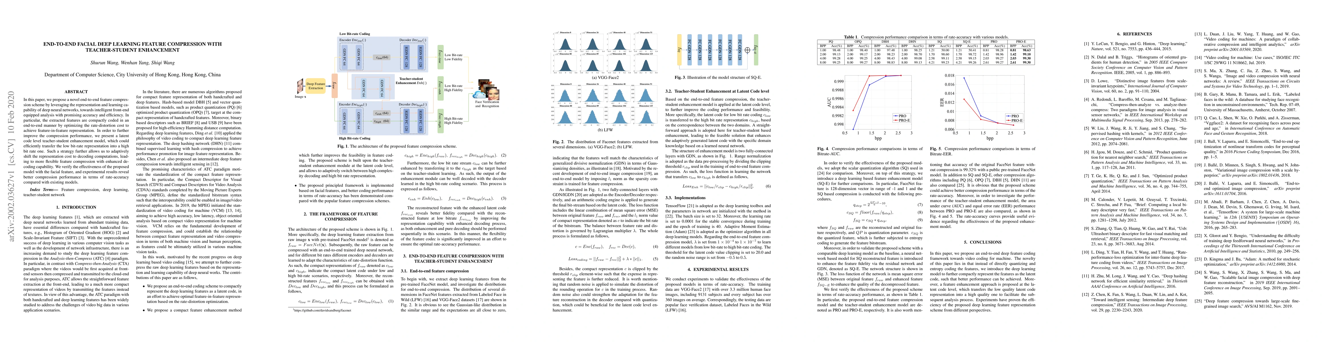 The paper proposes an end-to-end deep learning feature compression scheme for intelligent front-end analysis, utilizing a teacher-student model for latent code enhancement to achieve better rate-distortion balance. Experimental results show improved compression performance for facial features compared to existing methods.