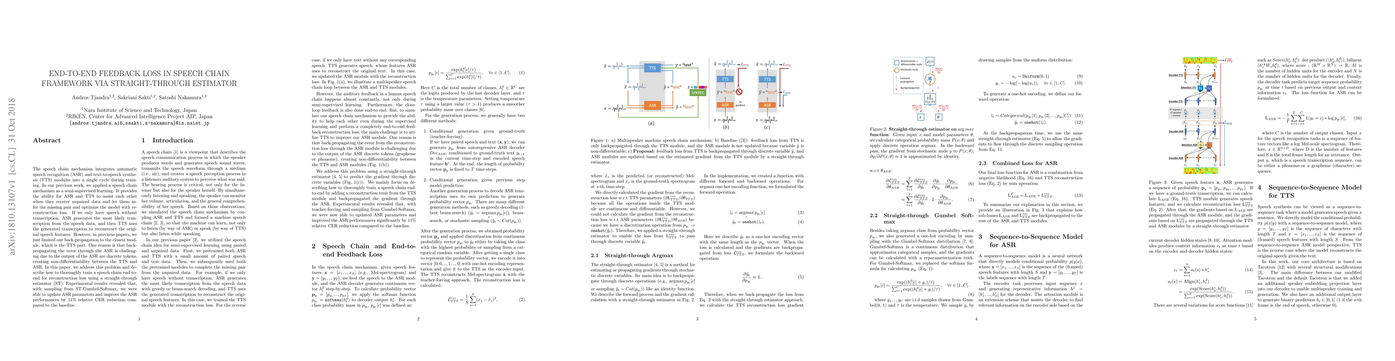 This paper proposes a method to train a speech chain framework end-to-end using a straight-through estimator to overcome non-differentiability issues in back-propagation through the ASR module. The approach enables improved ASR performance with a 11% relative CER reduction compared to the baseline.