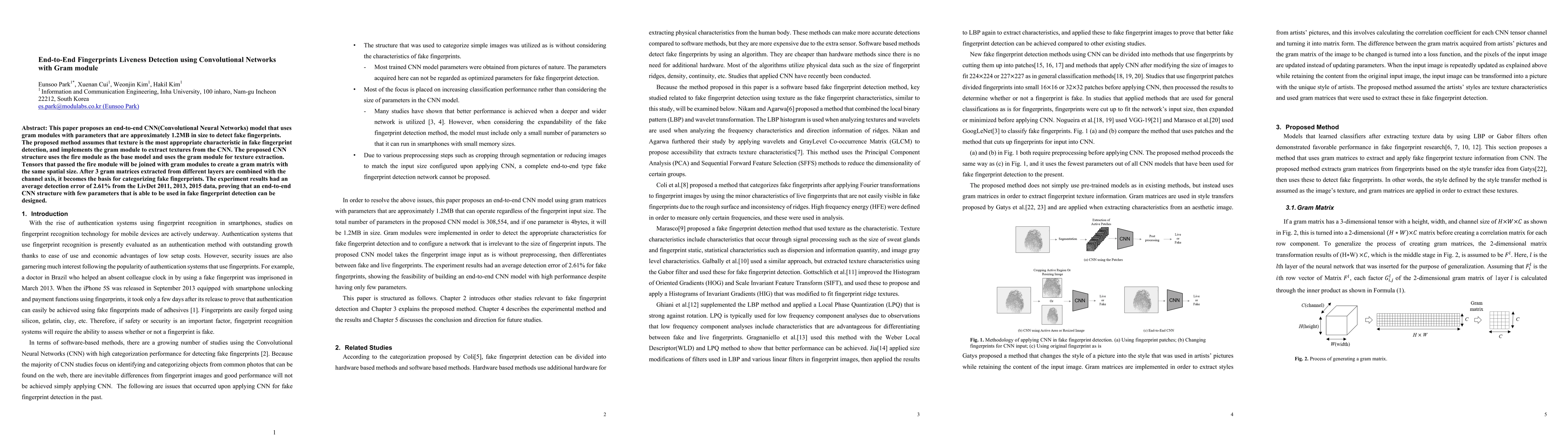 This paper introduces an end-to-end CNN model with gram modules for detecting fake fingerprints by extracting texture features. The proposed method achieved an average detection error of 2.61% using LivDet datasets, demonstrating effective liveness detection with minimal parameters.