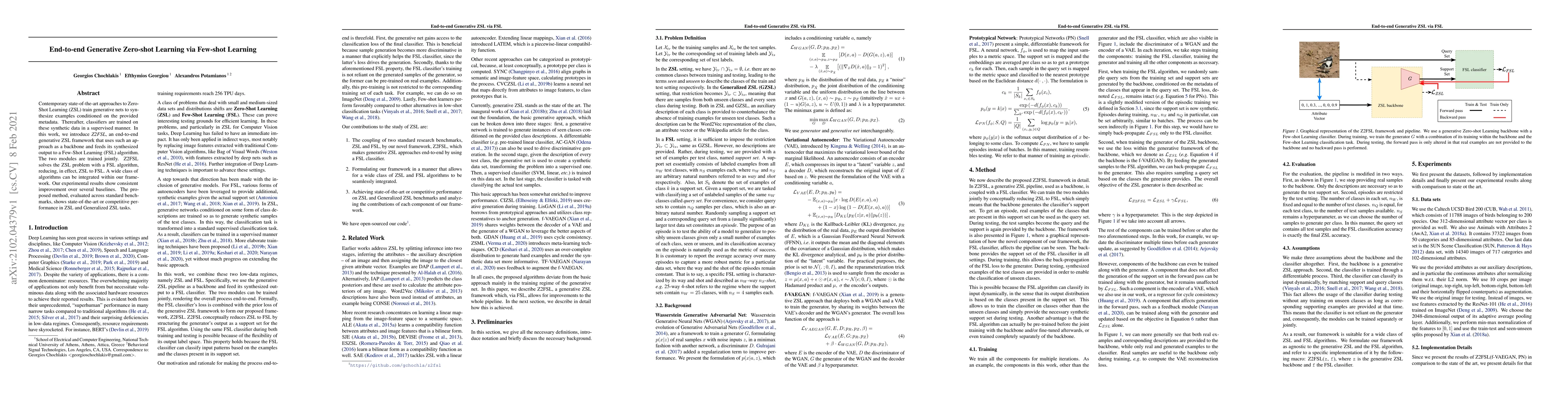 This paper introduces Z2FSL, an end-to-end generative Zero-Shot Learning framework that leverages Few-Shot Learning to synthesize data from metadata and trains it jointly. The method demonstrates consistent improvements over baselines and achieves state-of-the-art performance on standard benchmarks.