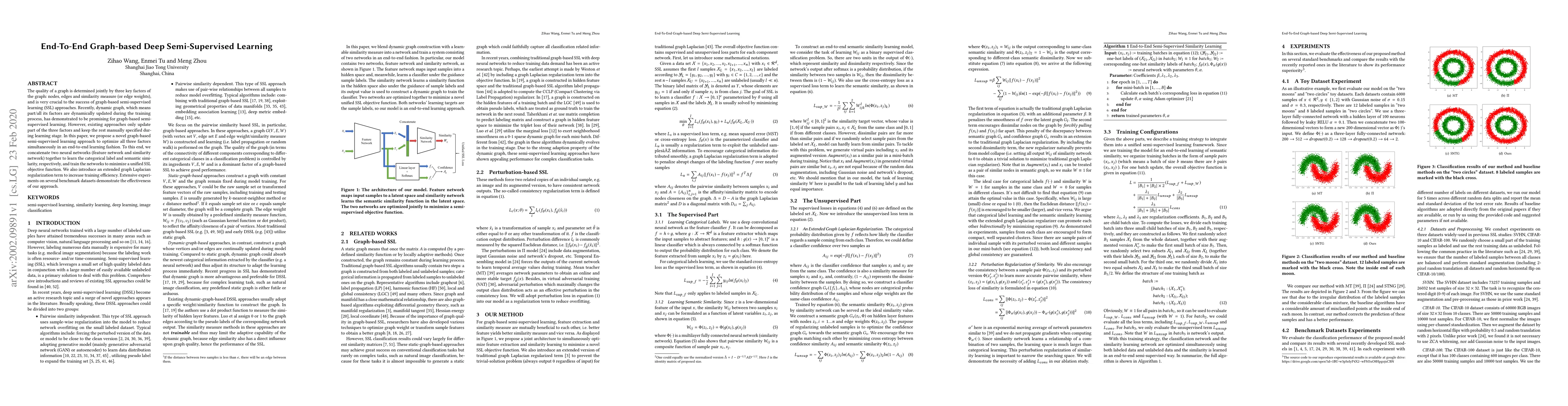 This paper proposes an end-to-end graph-based deep semi-supervised learning method that optimizes all three key graph factors—nodes, edges, and similarity measures—simultaneously. The approach combines feature and similarity networks to learn labels and semantic similarity, demonstrating improved performance on benchmark datasets.