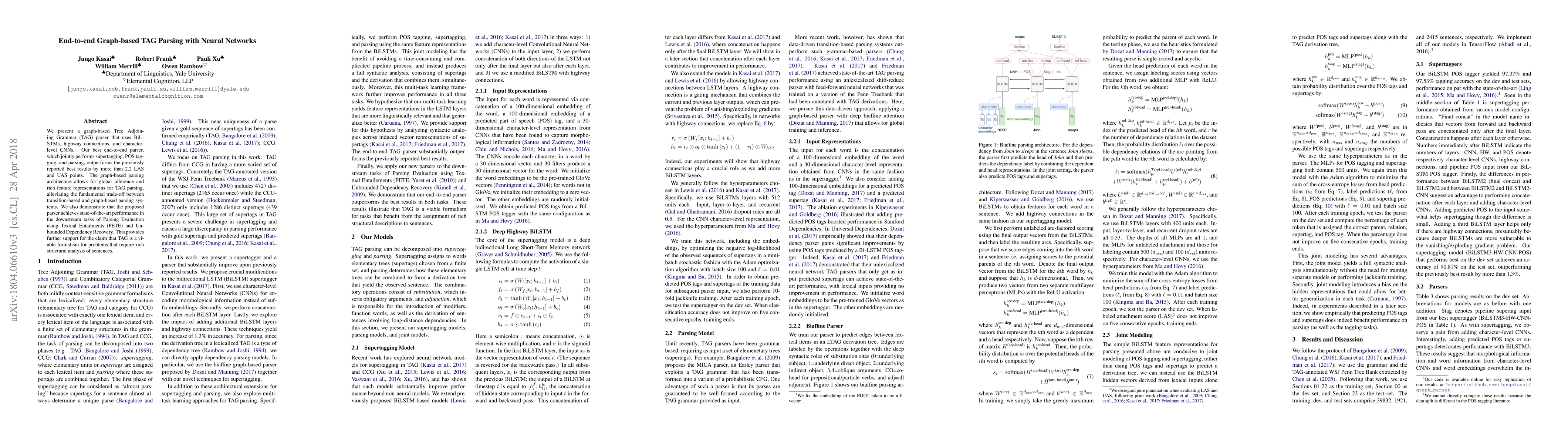This paper introduces a graph-based Tree Adjoining Grammar parser employing BiLSTMs, highway networks, and character-level CNNs, achieving superior performance over previous methods by over 2 LAS and UAS points. The architecture supports global inference and rich feature representations, enhancing the viability of TAG for structural sentence analysis.