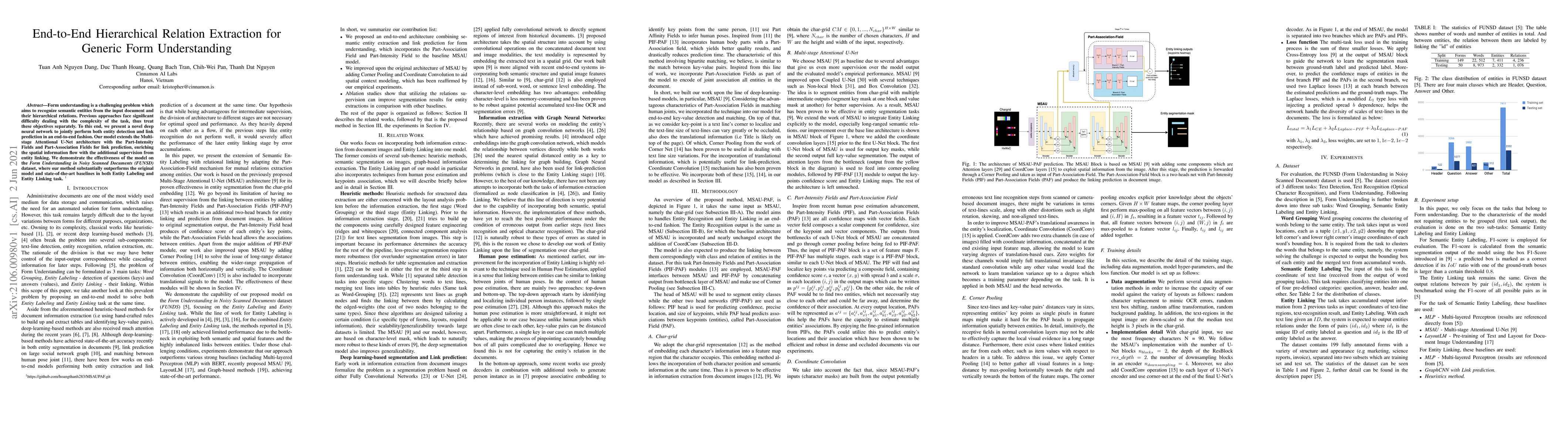 Form understanding is a challenging problem which aims to recognize semantic entities from the input document and their hierarchical relations. Previous approaches face significant difficulty dealing with the complexity of the task, thus treat these objectives separately. To this end, we present a novel deep neural network to jointly perform both entity detection and link prediction in an end-to-end fashion. Our model extends the Multi-stage Attentional U-Net architecture with the Part-Intensity Fields and Part-Association Fields for link prediction, enriching the spatial information flow with the additional supervision from entity linking. We demonstrate the effectiveness of the model on the Form Understanding in Noisy Scanned Documents (FUNSD) dataset, where our method substantially outperforms the original model and state-of-the-art baselines in both Entity Labeling and Entity Linking task.