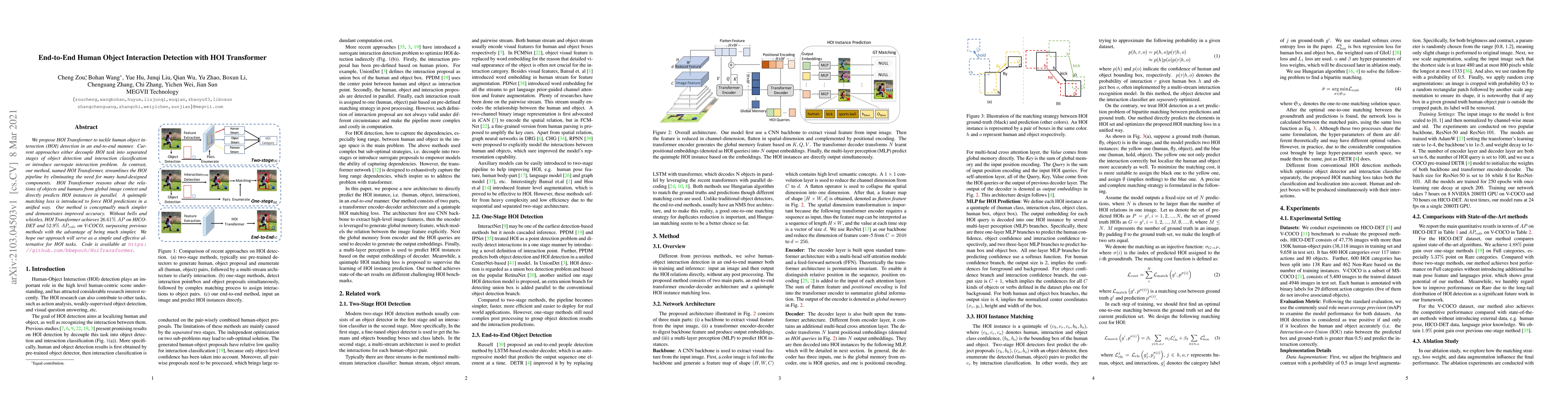 The HOI Transformer proposes an end-to-end method for detecting human-object interactions, simplifying the pipeline by eliminating separate components and directly predicting interactions from global context, achieving improved accuracy on HICO-DET and V-COCO datasets. The method's simplicity and effectiveness make it a strong alternative for human-object interaction detection tasks.