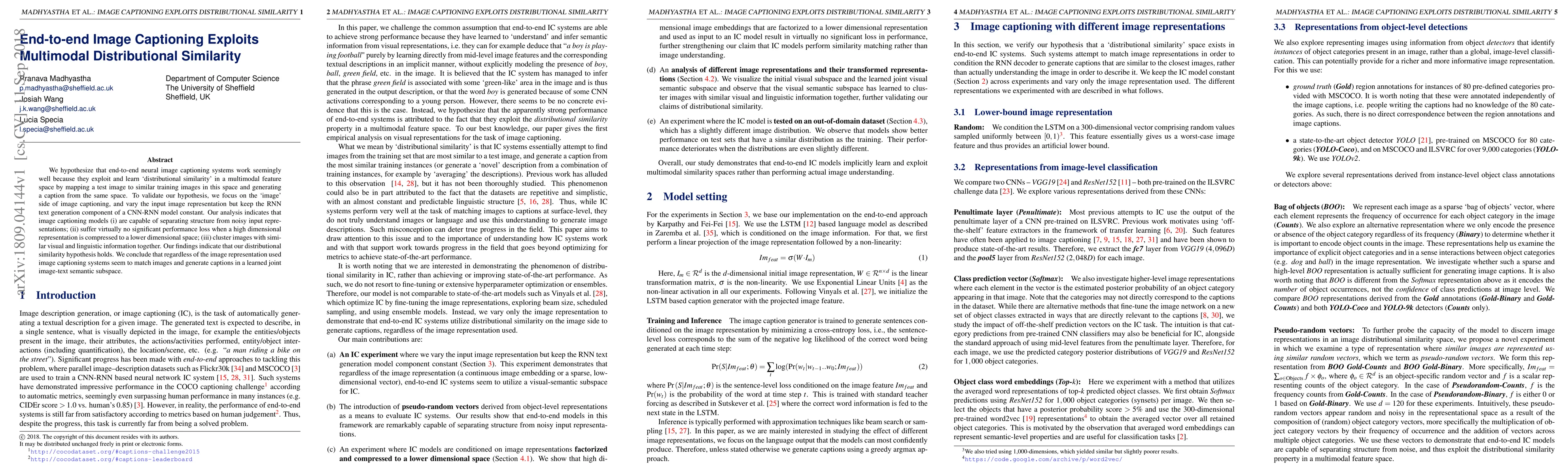 We hypothesize that end-to-end neural image captioning systems work seemingly well because they exploit and learn `distributional similarity' in a multimodal feature space by mapping a test image to similar training images in this space and generating a caption from the same space. To validate our hypothesis, we focus on the `image' side of image captioning, and vary the input image representation but keep the RNN text generation component of a CNN-RNN model constant. Our analysis indicates that image captioning models (i) are capable of separating structure from noisy input representations; (ii) suffer virtually no significant performance loss when a high dimensional representation is compressed to a lower dimensional space; (iii) cluster images with similar visual and linguistic information together. Our findings indicate that our distributional similarity hypothesis holds. We conclude that regardless of the image representation used image captioning systems seem to match images and generate captions in a learned joint image-text semantic subspace.