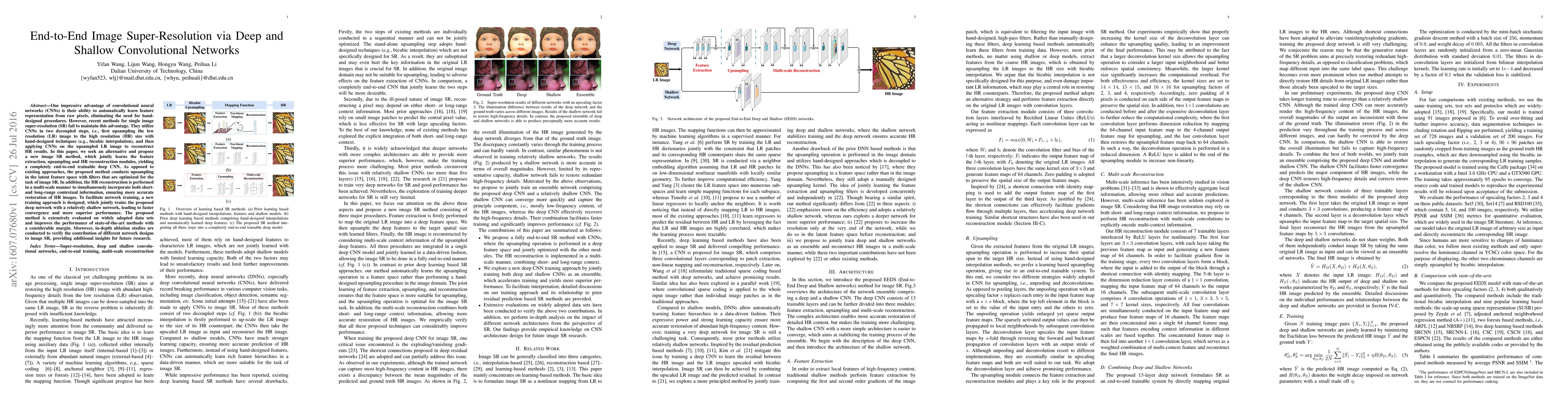 One impressive advantage of convolutional neural networks (CNNs) is their ability to automatically learn feature representation from raw pixels, eliminating the need for hand-designed procedures. However, recent methods for single image super-resolution (SR) fail to maintain this advantage. They utilize CNNs in two decoupled steps, i.e., first upsampling the low resolution (LR) image to the high resolution (HR) size with hand-designed techniques (e.g., bicubic interpolation), and then applying CNNs on the upsampled LR image to reconstruct HR results. In this paper, we seek an alternative and propose a new image SR method, which jointly learns the feature extraction, upsampling and HR reconstruction modules, yielding a completely end-to-end trainable deep CNN. As opposed to existing approaches, the proposed method conducts upsampling in the latent feature space with filters that are optimized for the task of image SR. In addition, the HR reconstruction is performed in a multi-scale manner to simultaneously incorporate both short- and long-range contextual information, ensuring more accurate restoration of HR images. To facilitate network training, a new training approach is designed, which jointly trains the proposed deep network with a relatively shallow network, leading to faster convergence and more superior performance. The proposed method is extensively evaluated on widely adopted data sets and improves the performance of state-of-the-art methods with a considerable margin. Moreover, in-depth ablation studies are conducted to verify the contribution of different network designs to image SR, providing additional insights for future research.