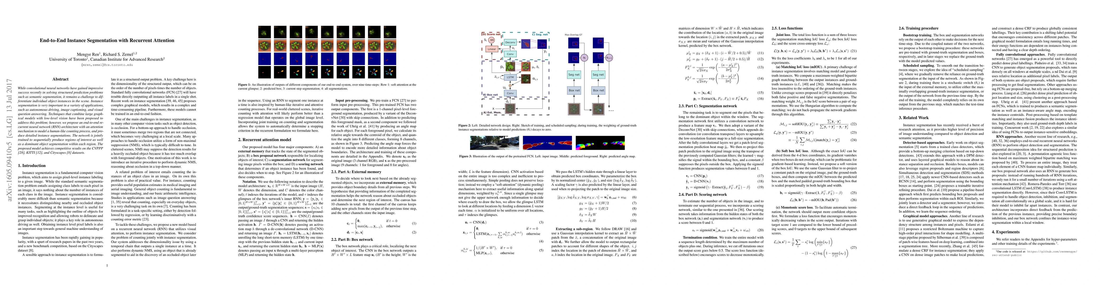 This paper proposes an end-to-end RNN architecture with an attention mechanism for detailed instance segmentation, achieving competitive results on multiple datasets. The model sequentially produces regions of interest and dominant object segmentations, addressing challenges in differentiating individual object instances.