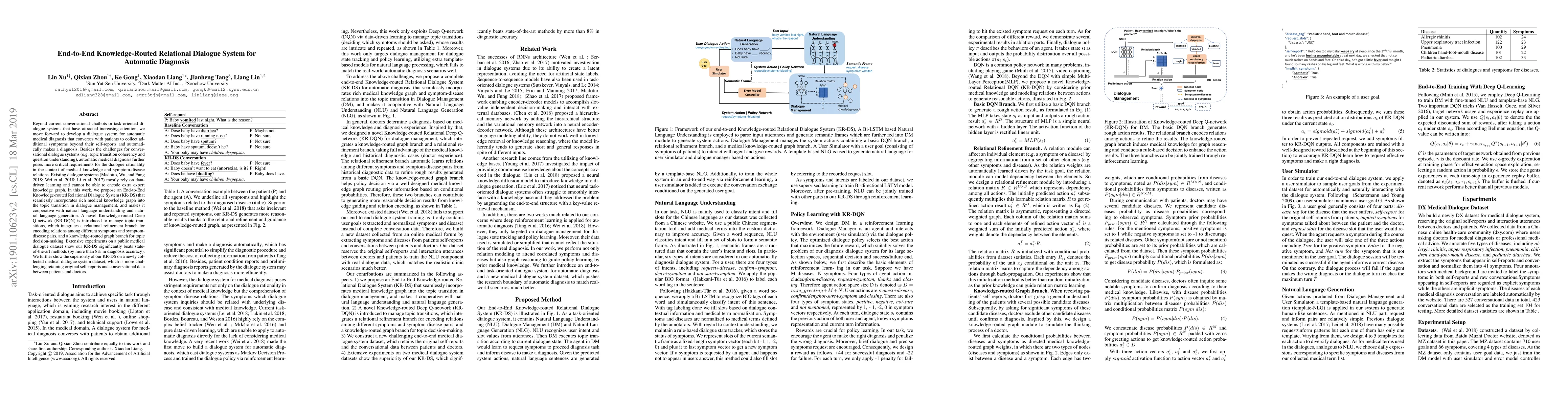 This paper proposes an End-to-End Knowledge-routed Relational Dialogue System (KR-DS) for automatic medical diagnosis, integrating a medical knowledge graph into dialogue management to enhance topic transition and diagnosis accuracy. The KR-DS employs a Knowledge-routed Deep Q-network (KR-DQN) to manage transitions and encode symptom-disease relations, achieving superior diagnosis accuracy over state-of-the-art methods.