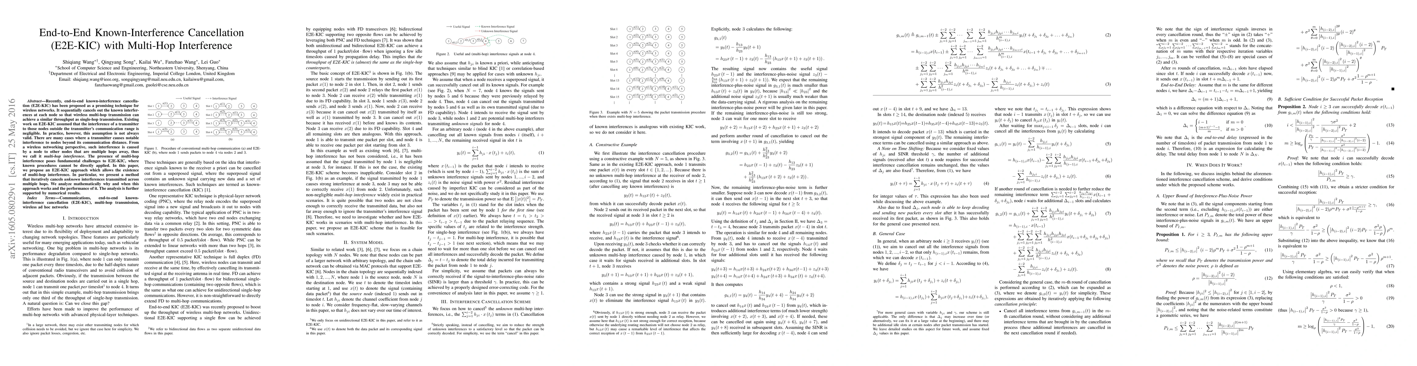This paper proposes an end-to-end known-interference cancellation (E2E-KIC) method to handle multi-hop interference in wireless networks, where traditional E2E-KIC fails due to interference beyond direct communication range. The proposed approach iteratively cancels multi-hop interference and is mathematically analyzed for its effectiveness and performance, supported by numerical results.