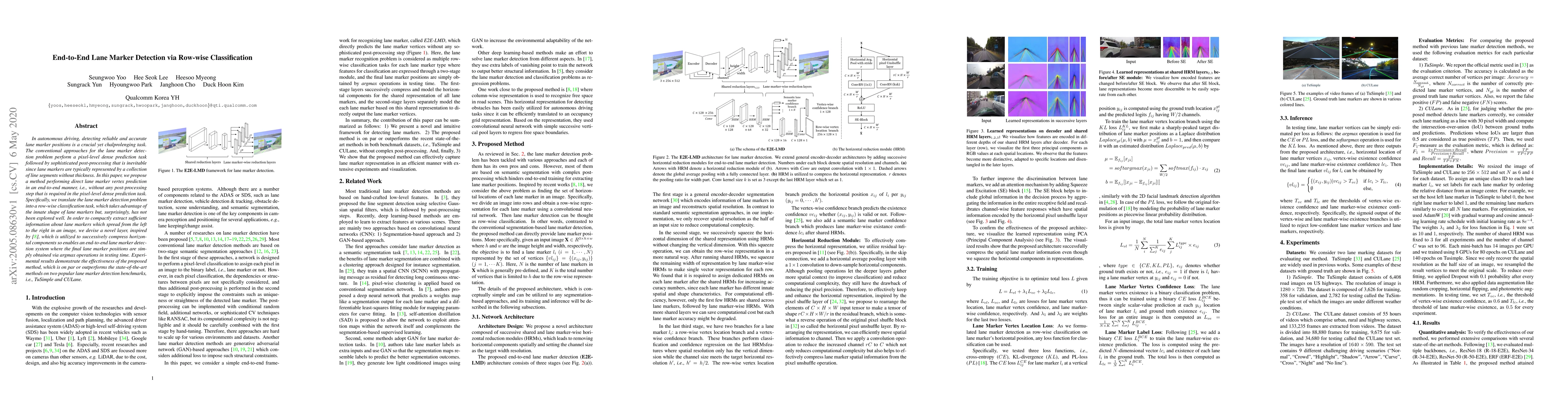 This paper proposes an end-to-end lane marker detection method that directly predicts lane marker vertices without post-processing, transforming the problem into a row-wise classification task. This approach leverages a novel layer to compress horizontal components, achieving competitive results on TuSimple and CULane benchmarks.