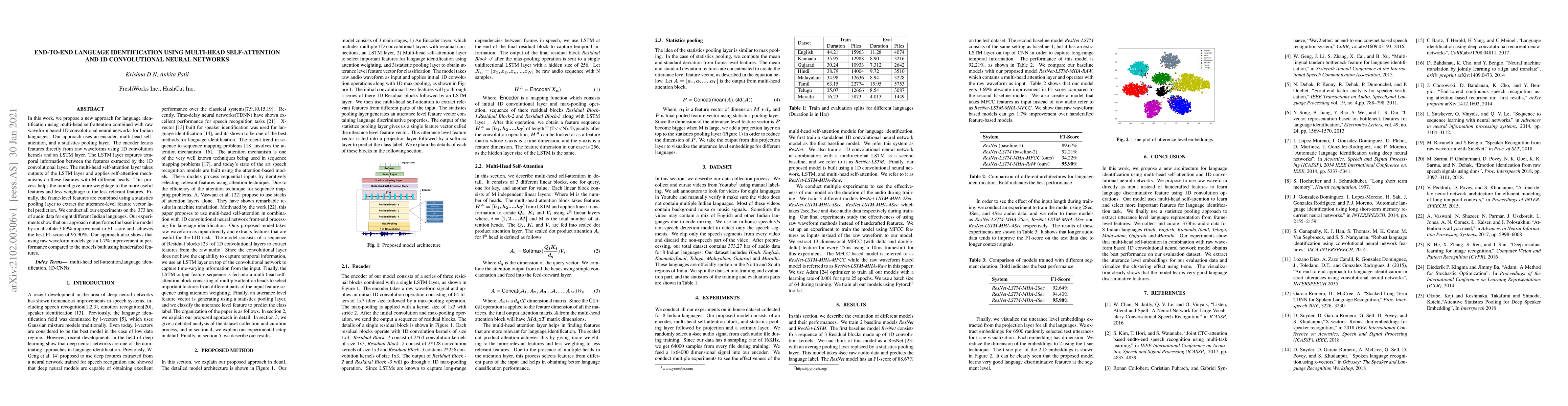 This paper proposes a novel language identification method combining multi-head self-attention with 1D convolutional neural networks for Indian languages, achieving a 3.69% improvement in F1-score over baseline models and demonstrating a 1.7% performance gain using raw waveform data over handcrafted features.