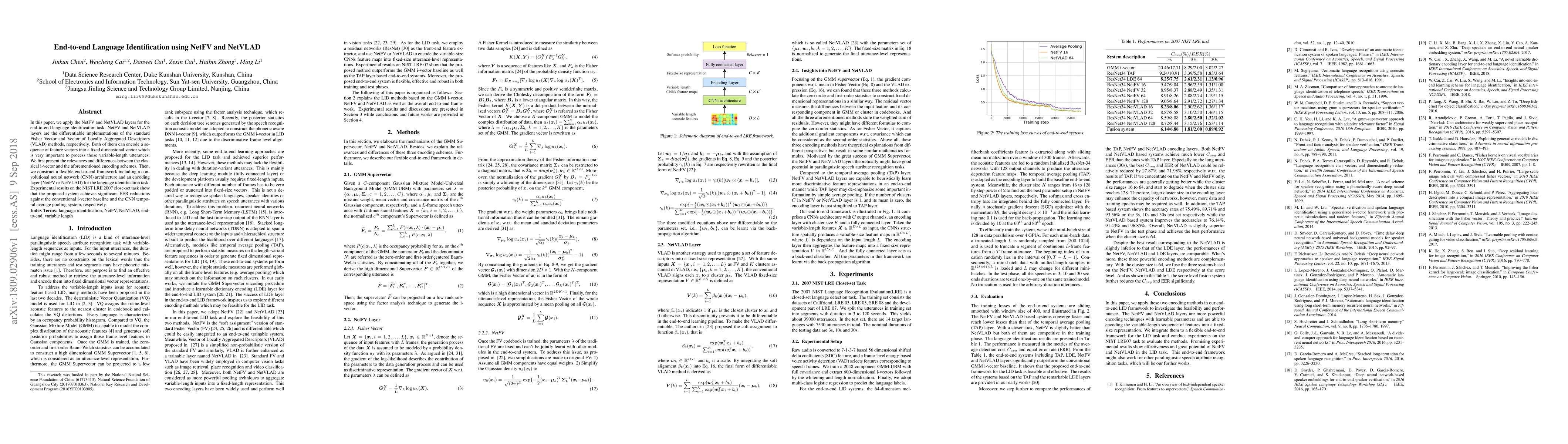 This paper proposes an end-to-end language identification framework using NetFV and NetVLAD layers, which are differentiable implementations of Fisher Vector and VLAD encoding methods. Experimental results demonstrate significant improvements over conventional i-vector and CNN temporal average pooling baselines on the NIST LRE 2007 dataset.