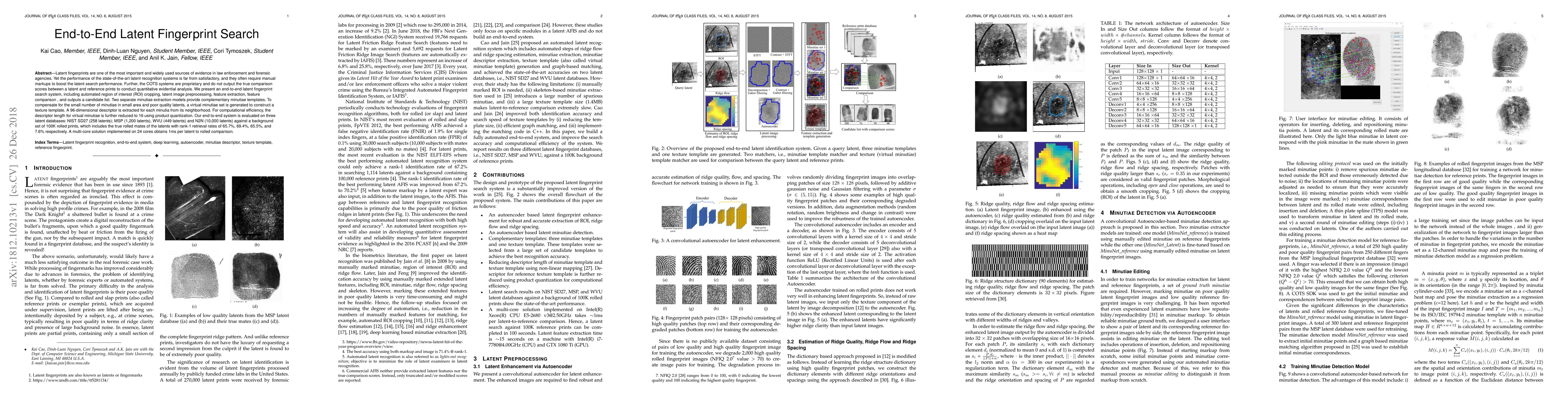 Latent fingerprints are one of the most important and widely used sources of evidence in law enforcement and forensic agencies. Yet the performance of the state-of-the-art latent recognition systems is far from satisfactory, and they often require manual markups to boost the latent search performance. Further, the COTS systems are proprietary and do not output the true comparison scores between a latent and reference prints to conduct quantitative evidential analysis. We present an end-to-end latent fingerprint search system, including automated region of interest (ROI) cropping, latent image preprocessing, feature extraction, feature comparison , and outputs a candidate list. Two separate minutiae extraction models provide complementary minutiae templates. To compensate for the small number of minutiae in small area and poor quality latents, a virtual minutiae set is generated to construct a texture template. A 96-dimensional descriptor is extracted for each minutia from its neighborhood. For computational efficiency, the descriptor length for virtual minutiae is further reduced to 16 using product quantization. Our end-to-end system is evaluated on three latent databases: NIST SD27 (258 latents); MSP (1,200 latents), WVU (449 latents) and N2N (10,000 latents) against a background set of 100K rolled prints, which includes the true rolled mates of the latents with rank-1 retrieval rates of 65.7%, 69.4%, 65.5%, and 7.6% respectively. A multi-core solution implemented on 24 cores obtains 1ms per latent to rolled comparison.