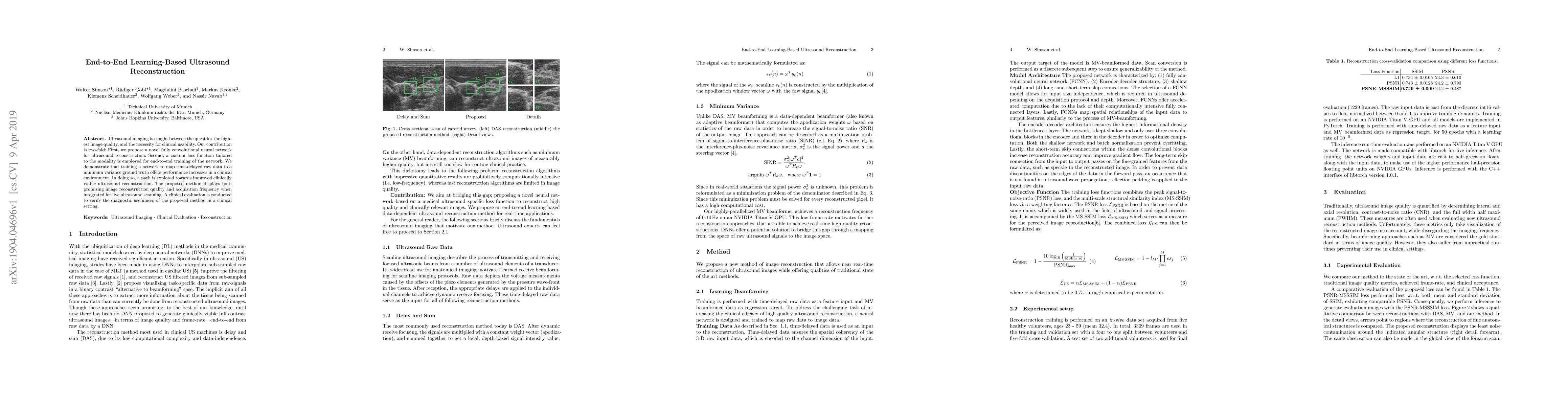 This paper proposes a novel fully convolutional neural network for ultrasound reconstruction, employing a custom loss function for end-to-end training. The method shows improved image quality and acquisition frequency, validated by clinical evaluation for its diagnostic usefulness.