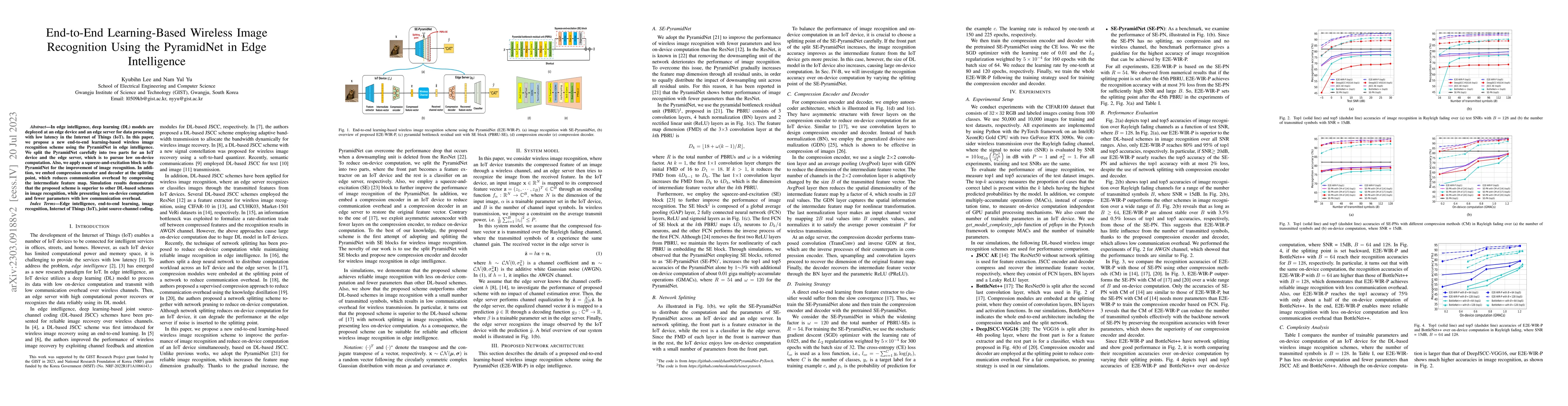 This paper proposes an end-to-end wireless image recognition scheme using PyramidNet in edge intelligence, splitting the model to optimize low-device computation and employing a squeeze-and-excitation block for better recognition. The scheme also uses compression techniques to reduce communication overhead, achieving superior performance with lower parameters and computation.