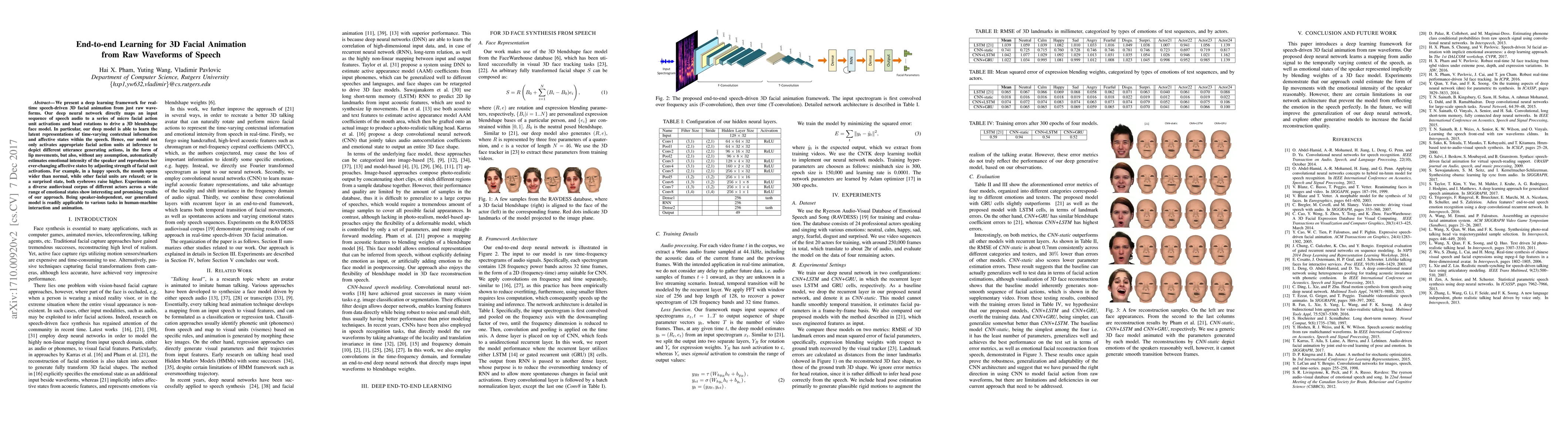 This paper introduces a deep learning framework for real-time 3D facial animation driven by raw speech waveforms, directly mapping audio to facial action units and head rotations, and automatically estimating emotional intensity without assumptions. The model shows promising results in depicting varied emotional expressions and is applicable to human-machine interaction and animation.