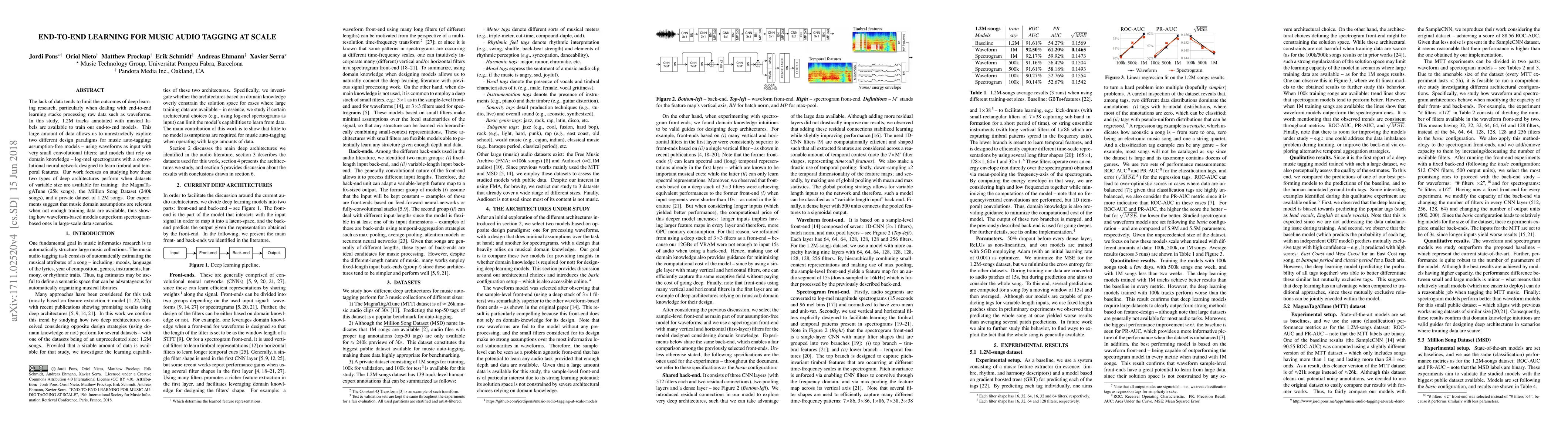 This study explores end-to-end learning for music audio tagging using 1.2M annotated tracks, comparing assumption-free waveform models with domain-knowledge-based spectrogram models. Results show that waveform-based models outperform spectrogram-based models in large-scale datasets.