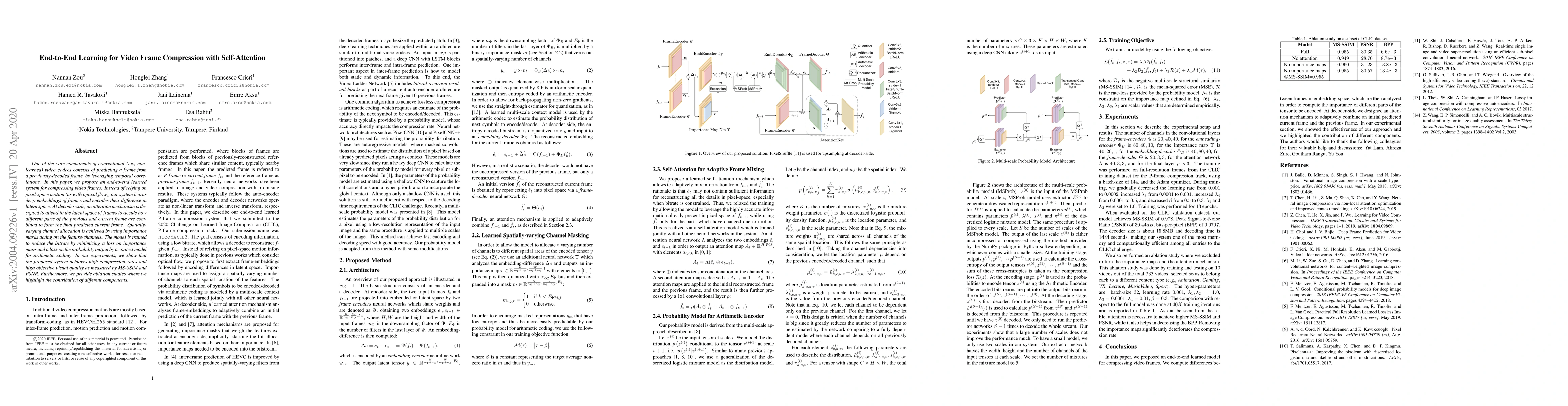 One of the core components of conventional (i.e., non-learned) video codecs consists of predicting a frame from a previously-decoded frame, by leveraging temporal correlations. In this paper, we propose an end-to-end learned system for compressing video frames. Instead of relying on pixel-space motion (as with optical flow), our system learns deep embeddings of frames and encodes their difference in latent space. At decoder-side, an attention mechanism is designed to attend to the latent space of frames to decide how different parts of the previous and current frame are combined to form the final predicted current frame. Spatially-varying channel allocation is achieved by using importance masks acting on the feature-channels. The model is trained to reduce the bitrate by minimizing a loss on importance maps and a loss on the probability output by a context model for arithmetic coding. In our experiments, we show that the proposed system achieves high compression rates and high objective visual quality as measured by MS-SSIM and PSNR. Furthermore, we provide ablation studies where we highlight the contribution of different components.